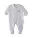 Prachtig babypakje in stralend wit, het pakje heeft een lichtblauw borduursel langs het kraagje en de voorzijde lopen, dit geeft het pakje een mega mooi en subtiel effect. Het pakje is velours en heeft in het klein op de borst een borduursel van een hobbelpaardje welke ook afgewerkt is met lichtblauw. Het babypakje heeft voetjes en een drukknoopsluiting over de voorzijde lopen welke doorloopt tussen de beentjes.