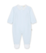 Super lief babypakje in de kleur lichtblauw met witte details zoals de witte pique punt kraag en de witte voetjes. Het pakje is gemaakt van velours. Het pakje heeft voetjes en lange mouwen, ook is het pakje voorzien van een drukknoopsluiting op de rug en tussen de beentjes. De witte pique kraag heeft als lichtblauw details kleine stipjes geborduurd langs de rand.