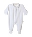 Dit mega fijne en super mooie babypakje is een perfecte basic om in de kast te hebben. Het pakje is wit van kleur met een fijn rond kraagje. Het pakje is gemaakt van velours katoen en het kraagje is normaal katoen. Het pakje heeft aan de voorzijde een drukknoopsluiting welke doorloopt tussen de beentjes. Het pakje heeft lange mouwen en voetjes. Door de kleur en de basic uitstraling van het pakje is het perfect unisex te dragen of om te geven wanneer het geslacht nog niet bekend is.