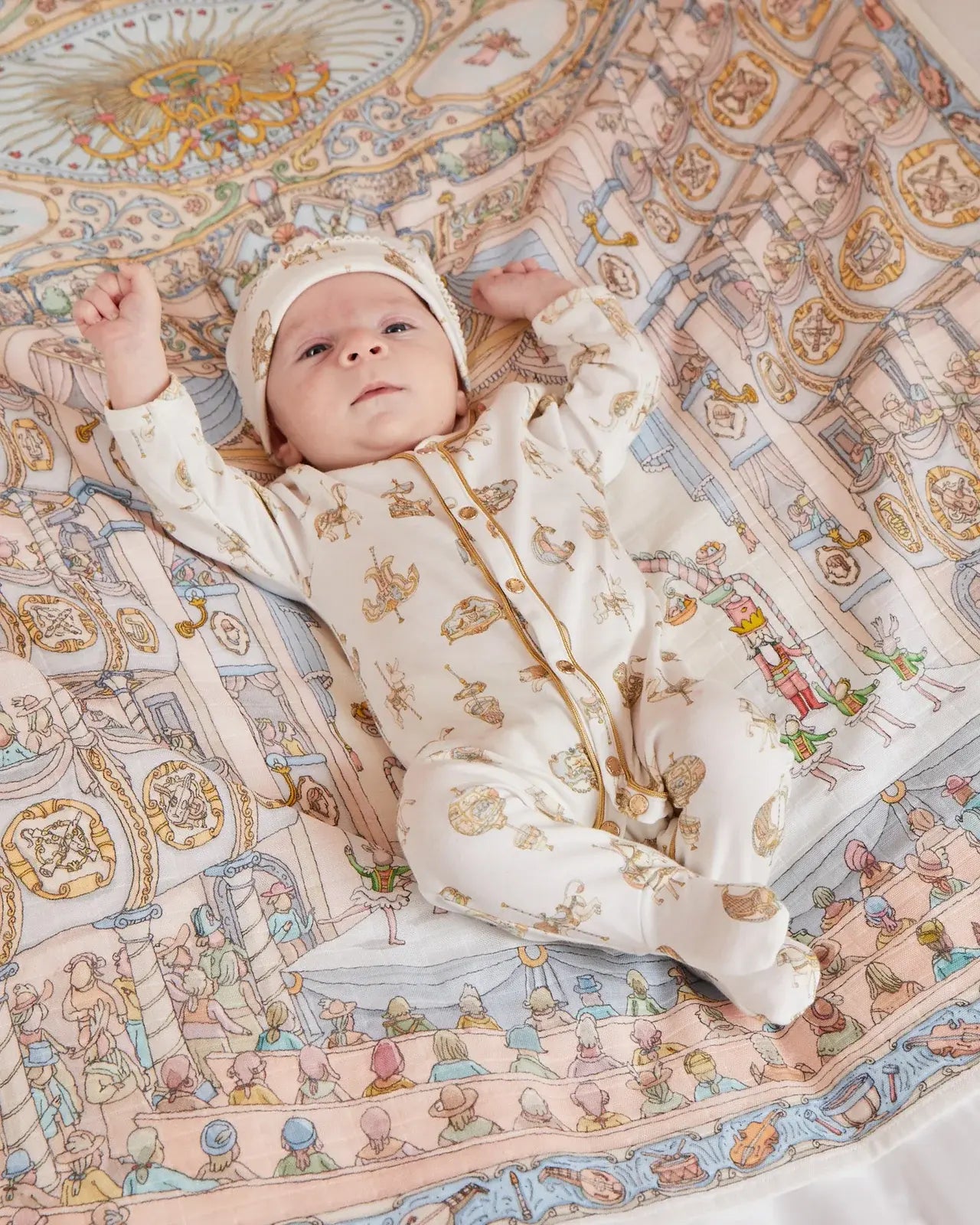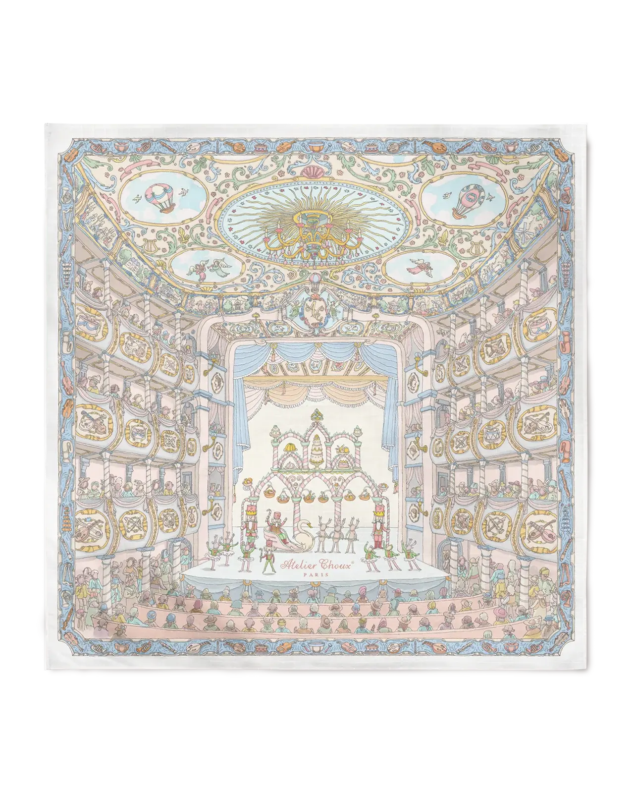 De Atelier Choux Carré Opéra toont een prachtig gedetailleerde illustratie van een klassiek operahuis, compleet ,et balkons, kroonluchters, en een levendig toneel. Dit kunstzinnige ontwerp brengt Franse elegantie en verfijning samen in een stijlvolle swaddle.