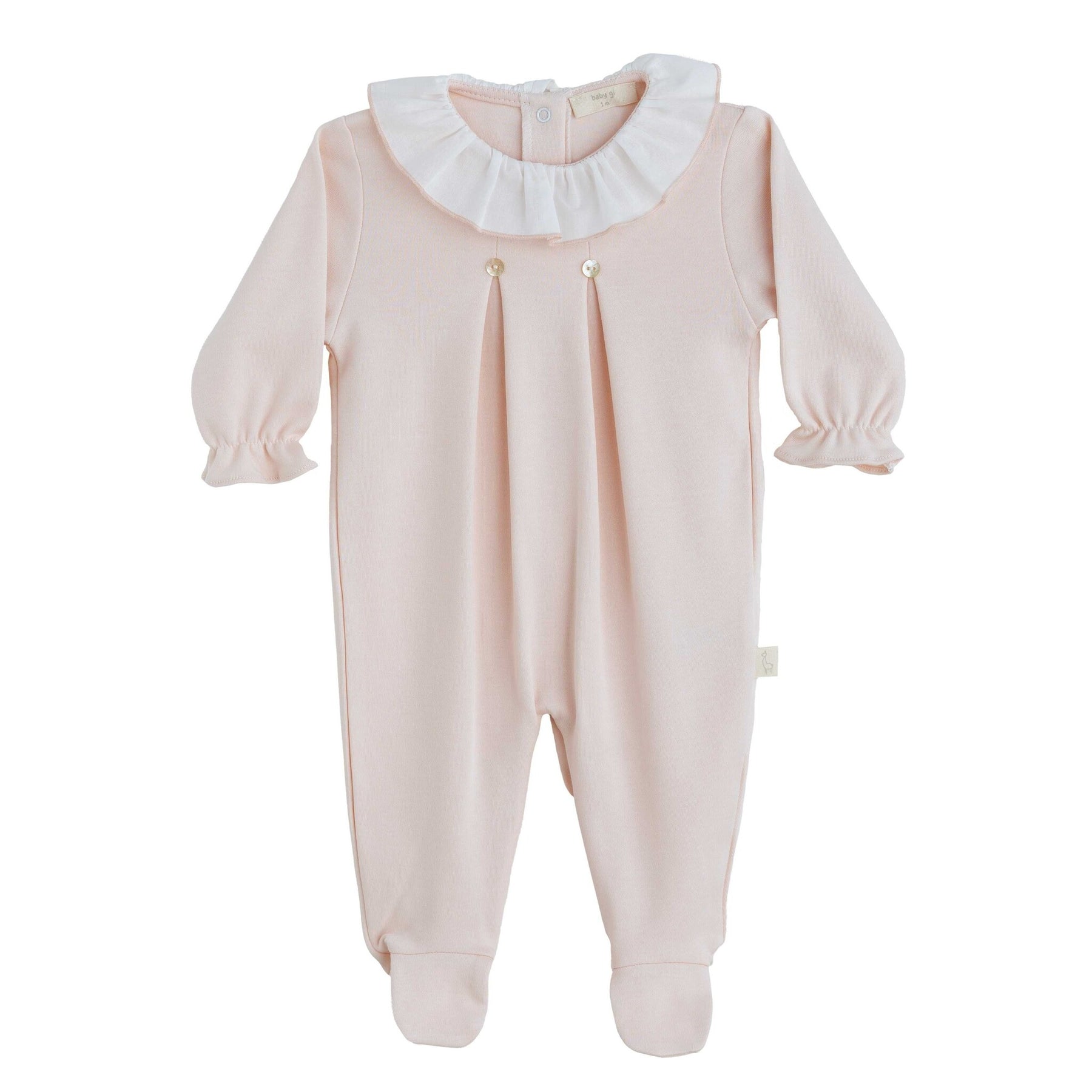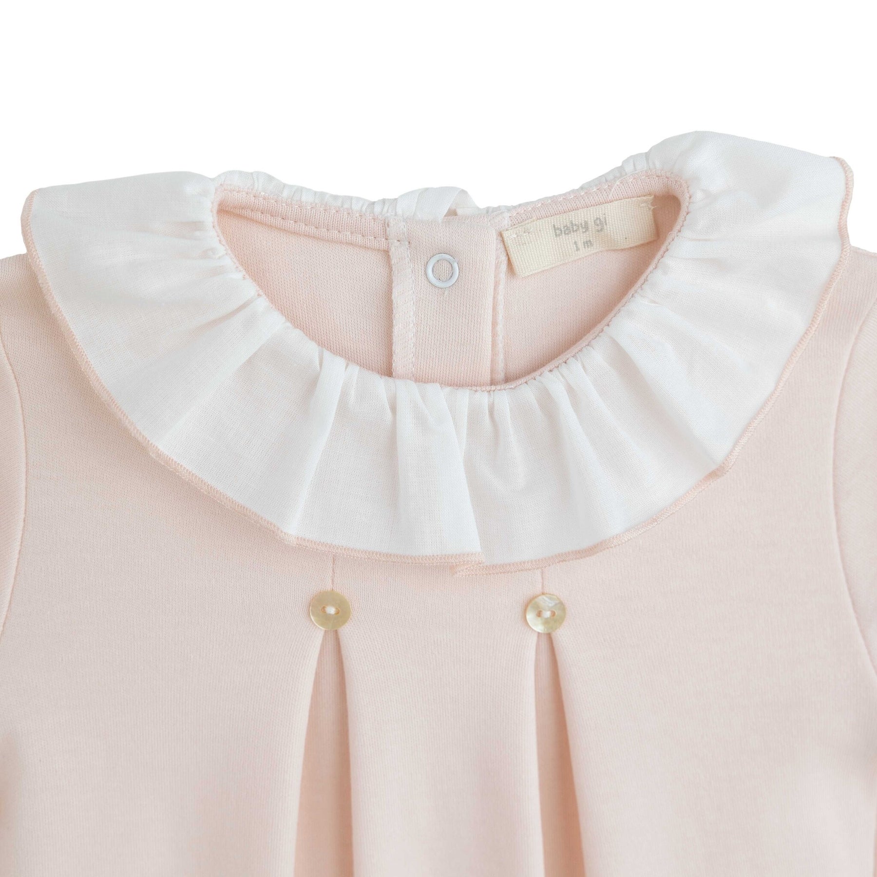 Dit super schattige babypakje van het merk Baby Gi is gemaakt in een fijne jersey katoenen stof in peach roze kleur. Het boxpakje heeft lange mouwen welke gesmokt zijn aan de uiteinde wat de mouwtjes een heel sierlijk en schattig effect geven. Vanaf de borst vak het pakje is hij geplooid boven de plooien heeft hij mooie luxe parelmoer kleurige knoopjes. Het pakje is een wijd vallend pakje door de plooien, wat niet alleen mooi is maar ook nog eens lekker comfortabel voor het kleine meisje. Het pakje heeft een dunne katoenen volant kraag in het wit wat het pakje weer een beetje breekt, de volant kraag is afgewerkt met een geborduurde rand in dezelfde peach kleur. Tussen de beentje heeft het pakje blinder sluit knoopjes waardoor het meisje makkelijk verschoond kan worden.