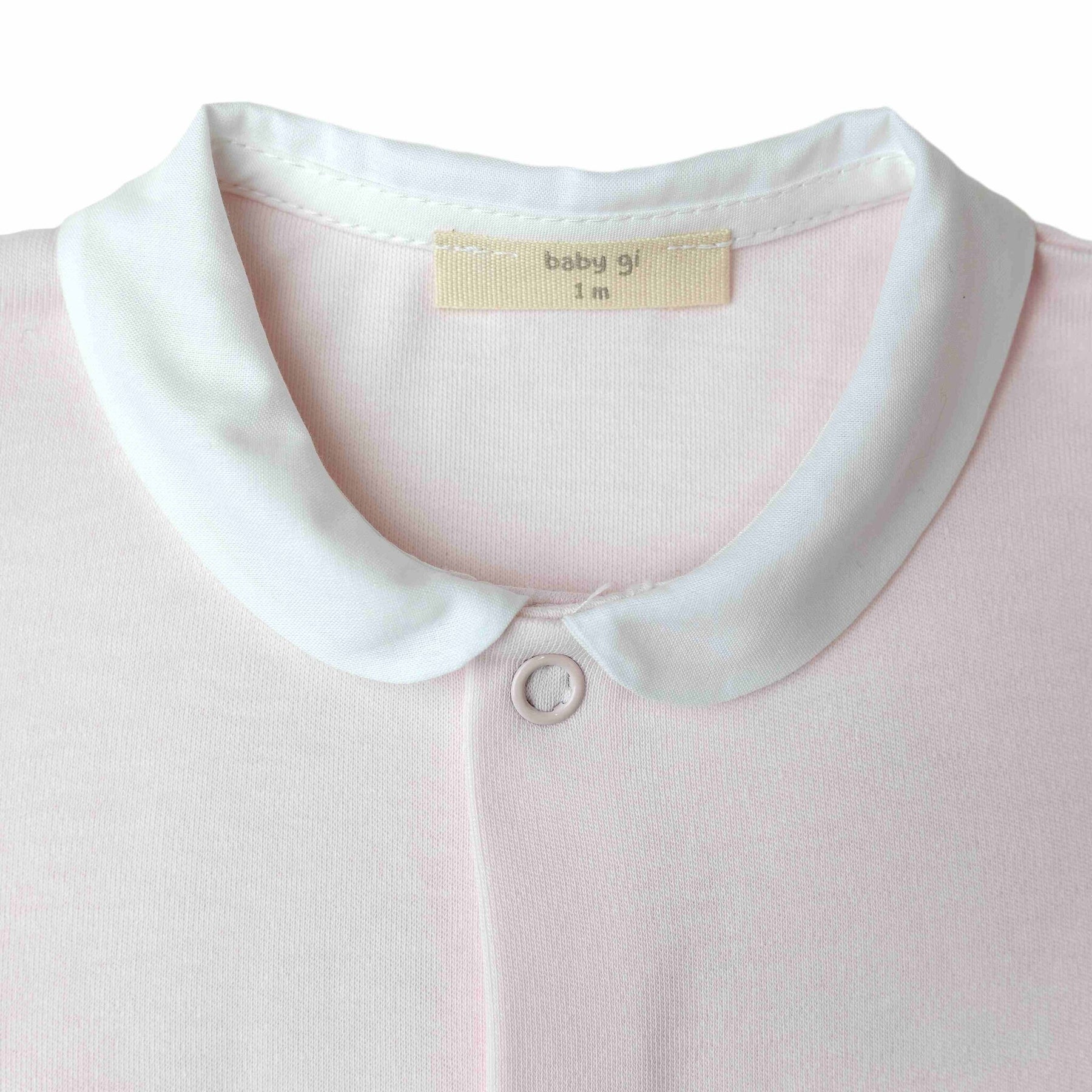 Babypakje van het merk Baby Gi. Het pakje is van een mooie stretch katoenen stof. Heeft een mooi rond glans katoenen kraagje in wit net zoals de voetjes. Aan de achterzijde heeft het pakje vleugels in witte velours stof. Het pakje heeft een bijpassend mutsje.