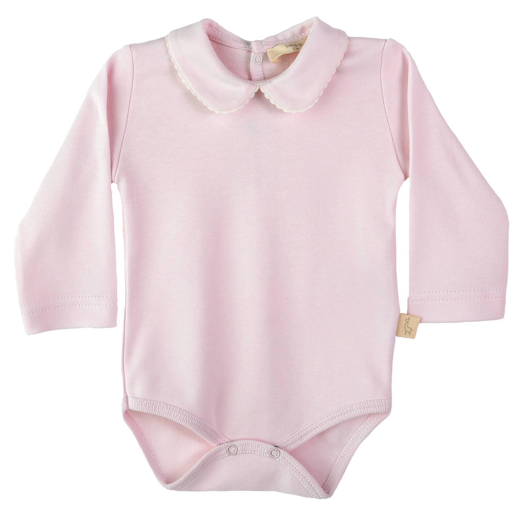 Tijdloze romper met ronde kraag van het merk Baby Gi. De romper is gemaakt van hoogwaardig katoen en voelt zacht en comfortabel aan. Het ronde peter pan kraagje is afgewerkt met een subtiel biesje, wat zorgt voor een klassieke en verfijnde uitstraling.
