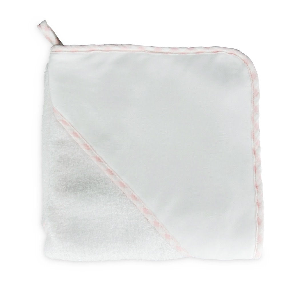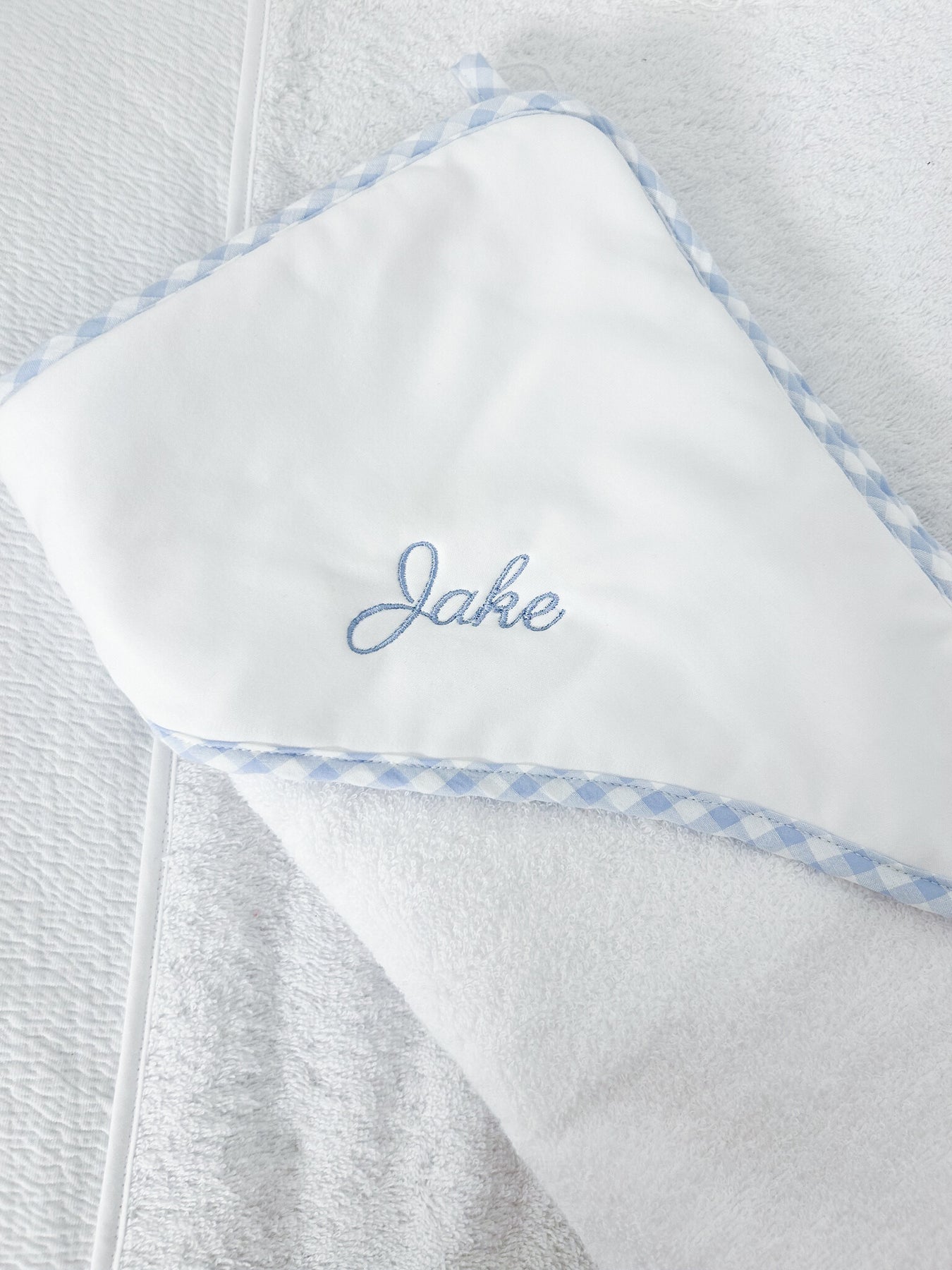 Deze grote en zachte badcape heeft een grote katoenen kap welke tot over de gehele badcape is afgewerkt met een bies in Vichi print. Maak de badcape uniek door hem te personaliseren met de naam van het kindje of één van onze andere borduursels. De badcape is verkrijgbaar in lichtblauw en lichtroze