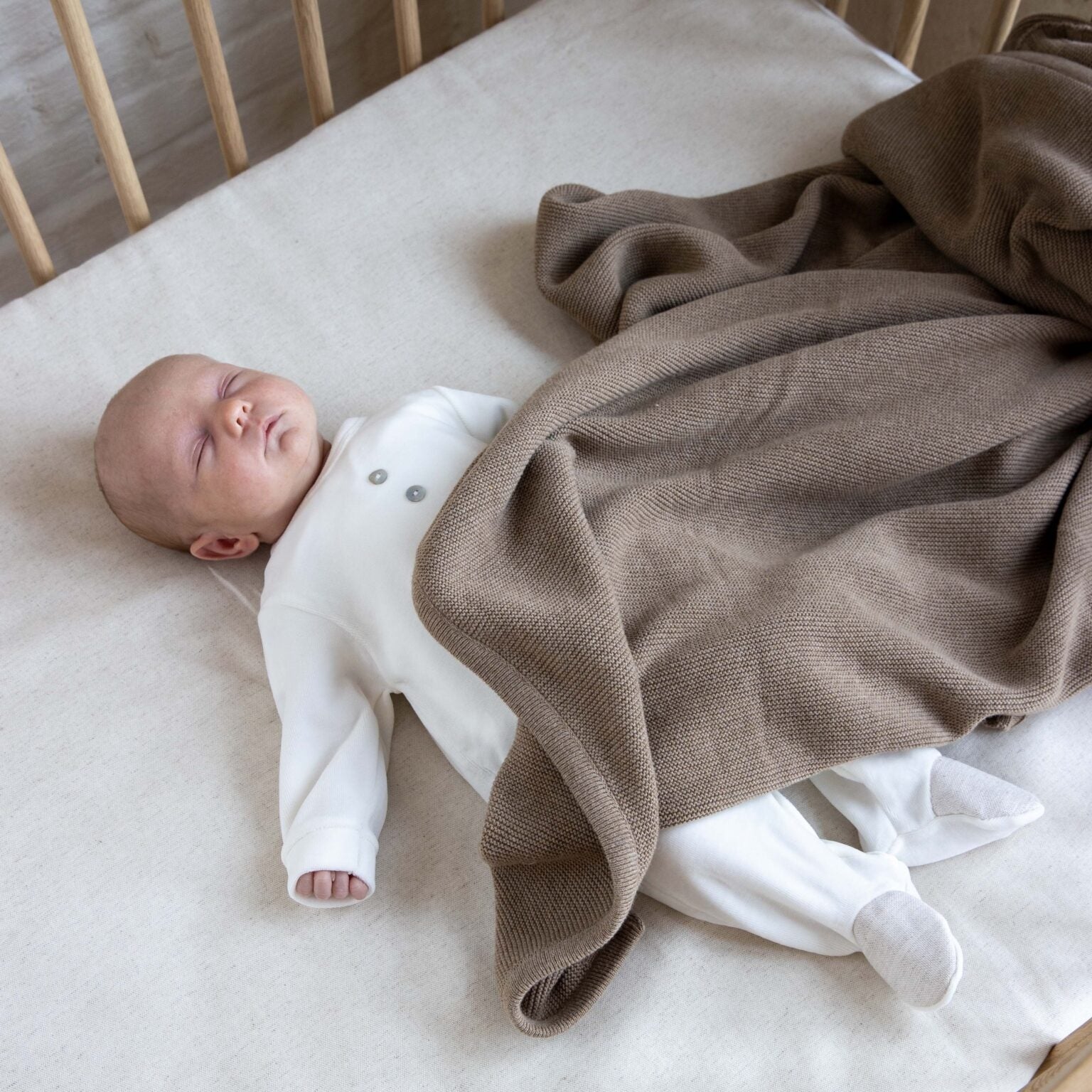 Deze prachtige grote gebreide donkerbruine deken (100x150cm) is ideaal om te gebruiken in het ledikant. Dankzij zijn royale formaat biedt de deken niet alleen warmte, maar geeft ook een knusse uitstraling in de babykamer. De neutrale, warme kleur past moeiteloos in ieder interieur en combineert prachtig bij ander babytextiel