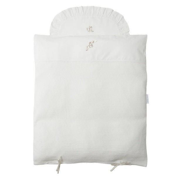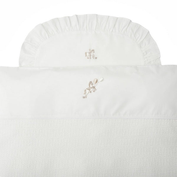 Wiegovertrek + kussenhoes uit de Carrousel Collectie van het merk Theophile et Patachou. Deze prachtige set in combinatie van glans- en gewafeld katoen is perfect voor het wiegje van het kindje. Maar ook super mooi voor in de reiswieg van de kinderwagen. De set is afgewerkt met een delicaat borduurwerk.