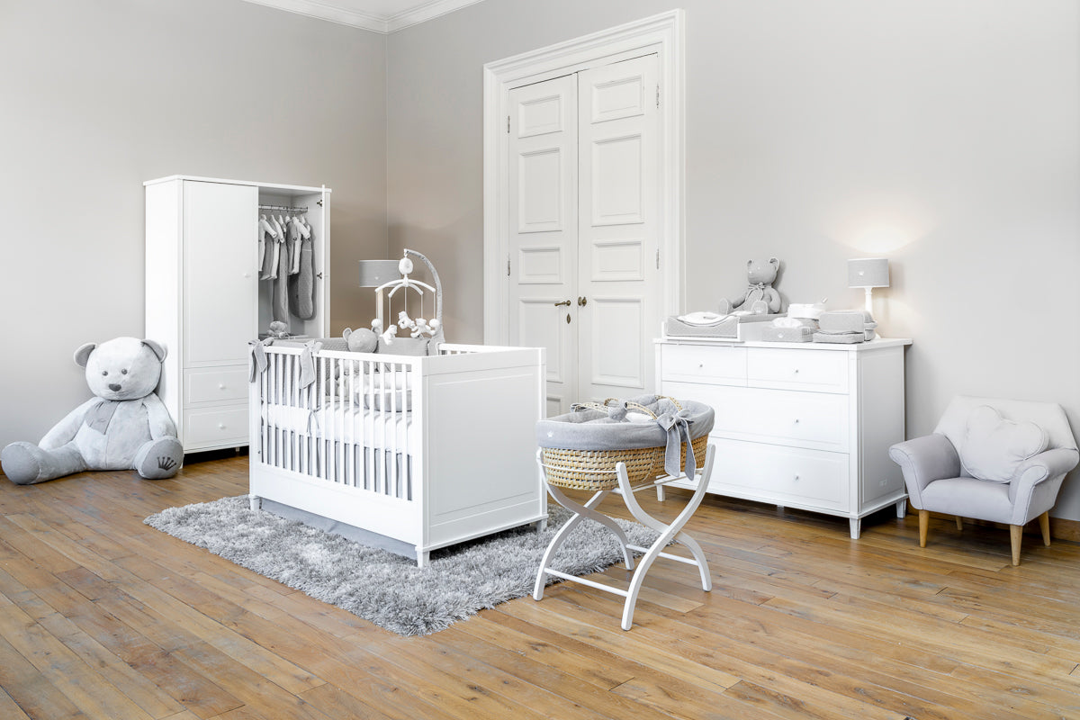 De Commode Gio van First (My First Collection) is een elegante en bijzonder praktische toevoeging aan de babykamer. Het volledig witte design, gecombineerd met de subtiele panelen en minimalistische ronde knopjes, geeft deze commode een zachte, klassieke uitstraling die perfect past binnen de rustige stijl van de Gio-collectie.