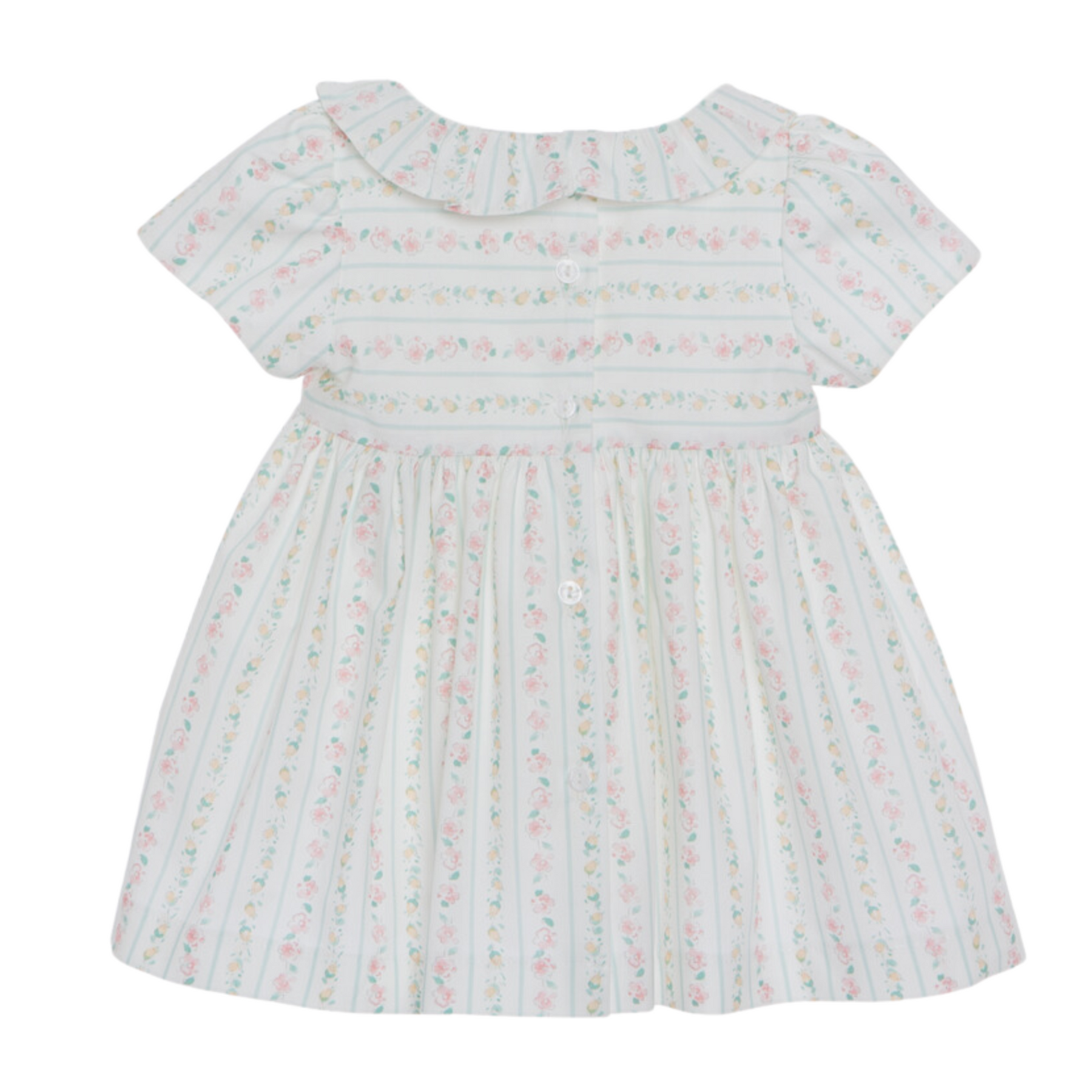 Dit onweerstaanbare schattige jurkje met bloemenprint van het merk Patachou is een charmant jurkje voor tijdens de heerlijke warme zomerdagen, alle pastel kleurtjes welke verwerkt zijn in de print denk aan lichtroze, pastel geel, lichtblauw en groen zeggen zomer! Prints als deze zul je veel terug gaan zien in de collecties van dit seizoen. Het jurkje is van een mooie voile katoenen stof met en heeft een gevoerd onder jurkje waardoor hij niet doorschijnt. De jurk heeft korte geplooide mouwtjes welke zijn versierd met een mooie ruche in dezelfde stof deze ruche rand loopt door tot op de borst van het meisje. De rechte hals maakt het jurkje net even anders als de meeste jurkjes. Een ander mooi detail zijn de plooien op de borst, uiteraard is dit afgewerkt met het merk embleem van het prachtige Patachou.