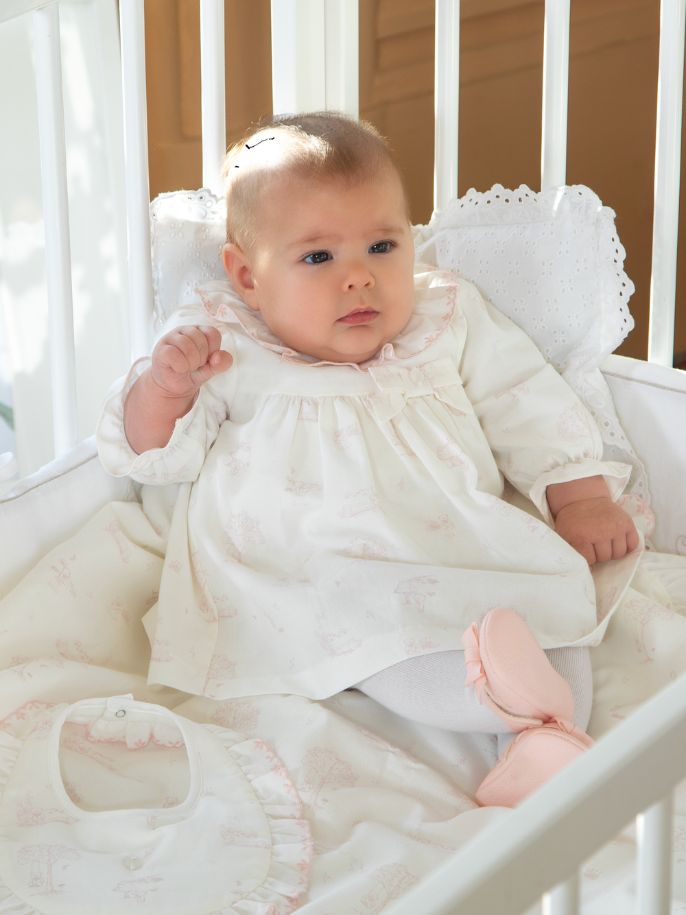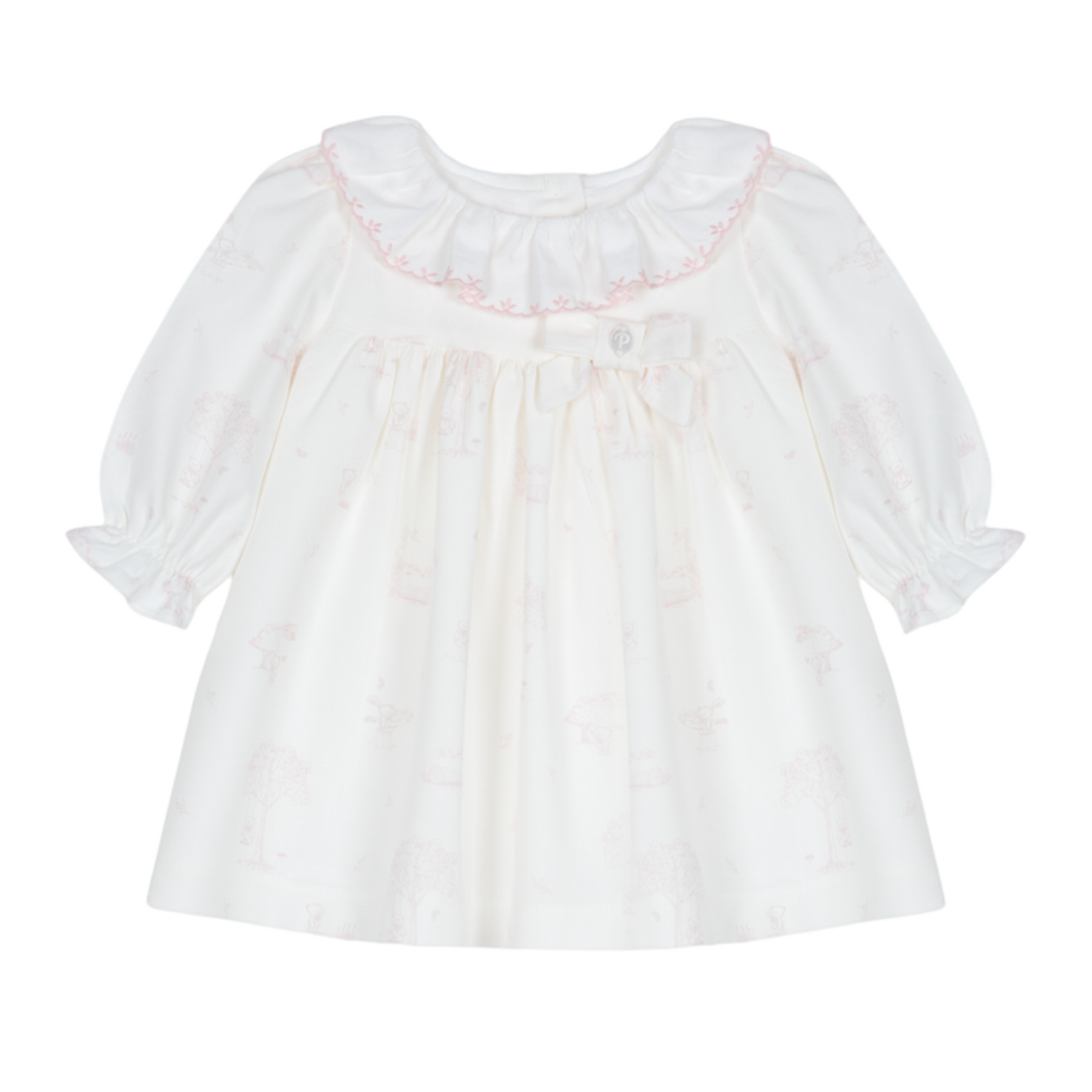 Deze prachtige meisjes achtige jurk is gebroken wit van kleur met een sierlijke lichtroze toile de jouy print. Het jurkje loopt in een a lijn, dit geeft het jurkje een meisjesachtige chique uitstraling. Het jurkje heeft een popeline kraagje in dezelfde kleur als het jurkje welke afgewerkt is met lichtroze borduursel. Het jurkje heeft een ietwat pofmouwtje en een sierlijk lief strikje op de voorzijde, dit maakt het jurkje helemaal af. Op de achterzijde heeft de jurk een knoopsluiting, ook heeft de jurk een onderjurkje.