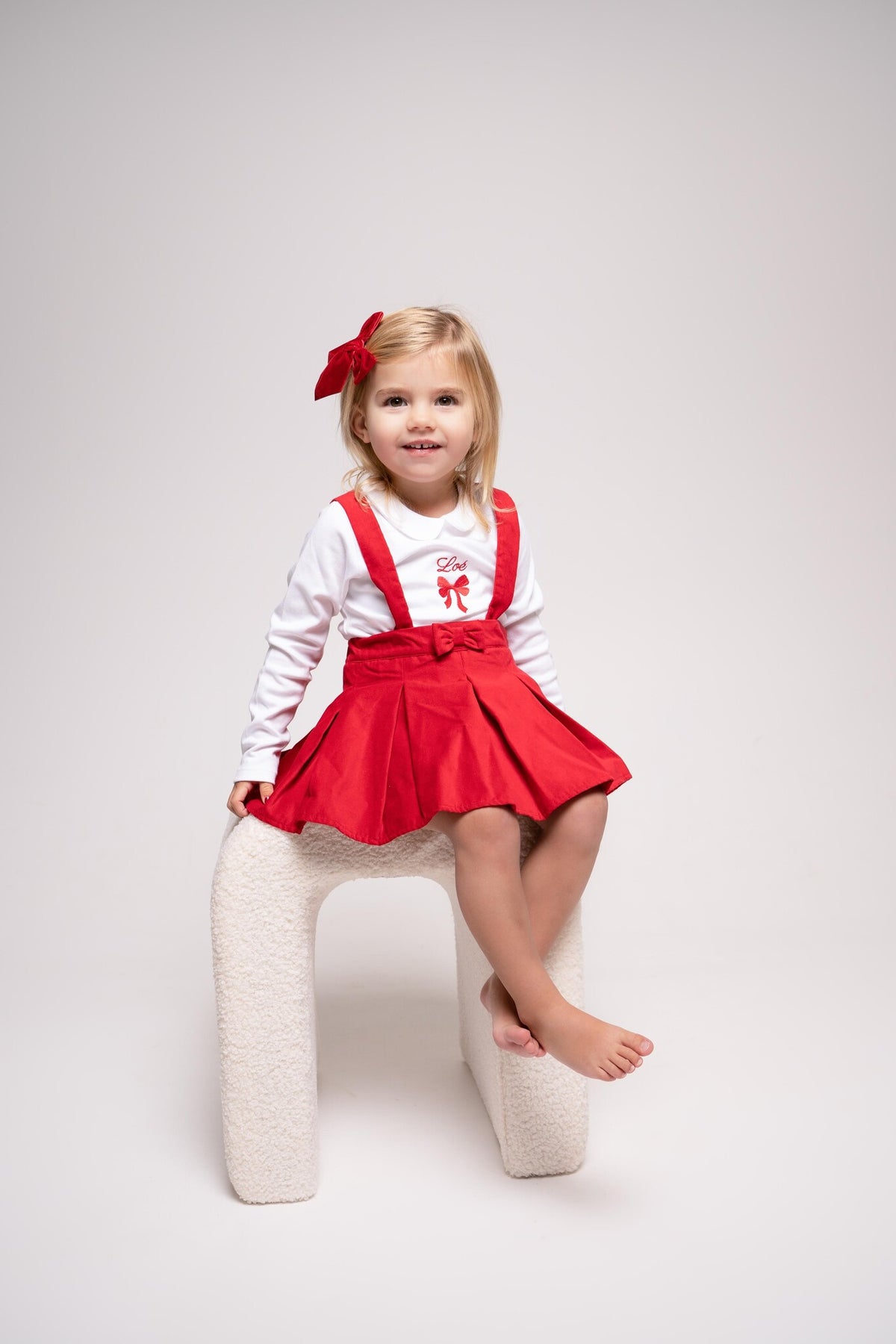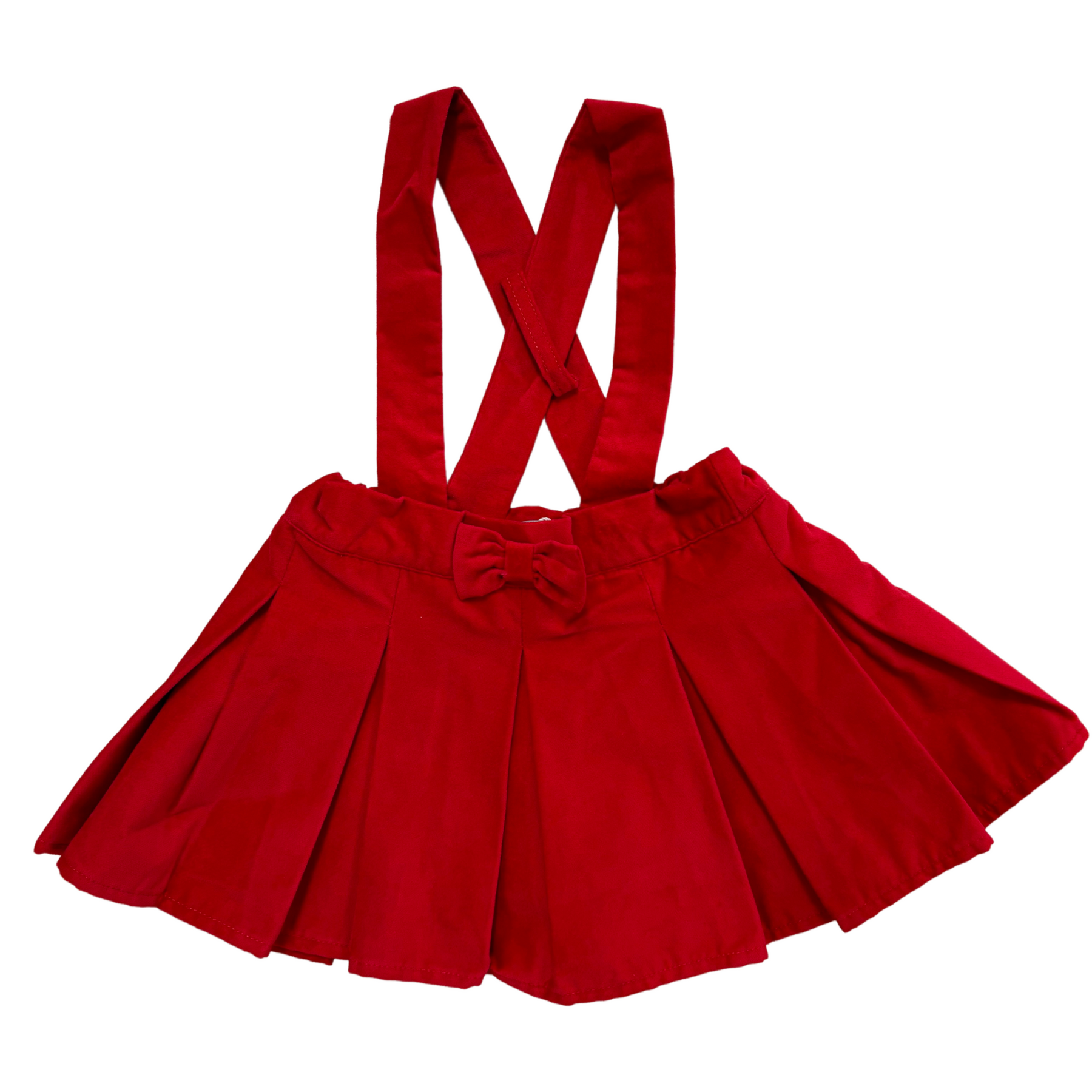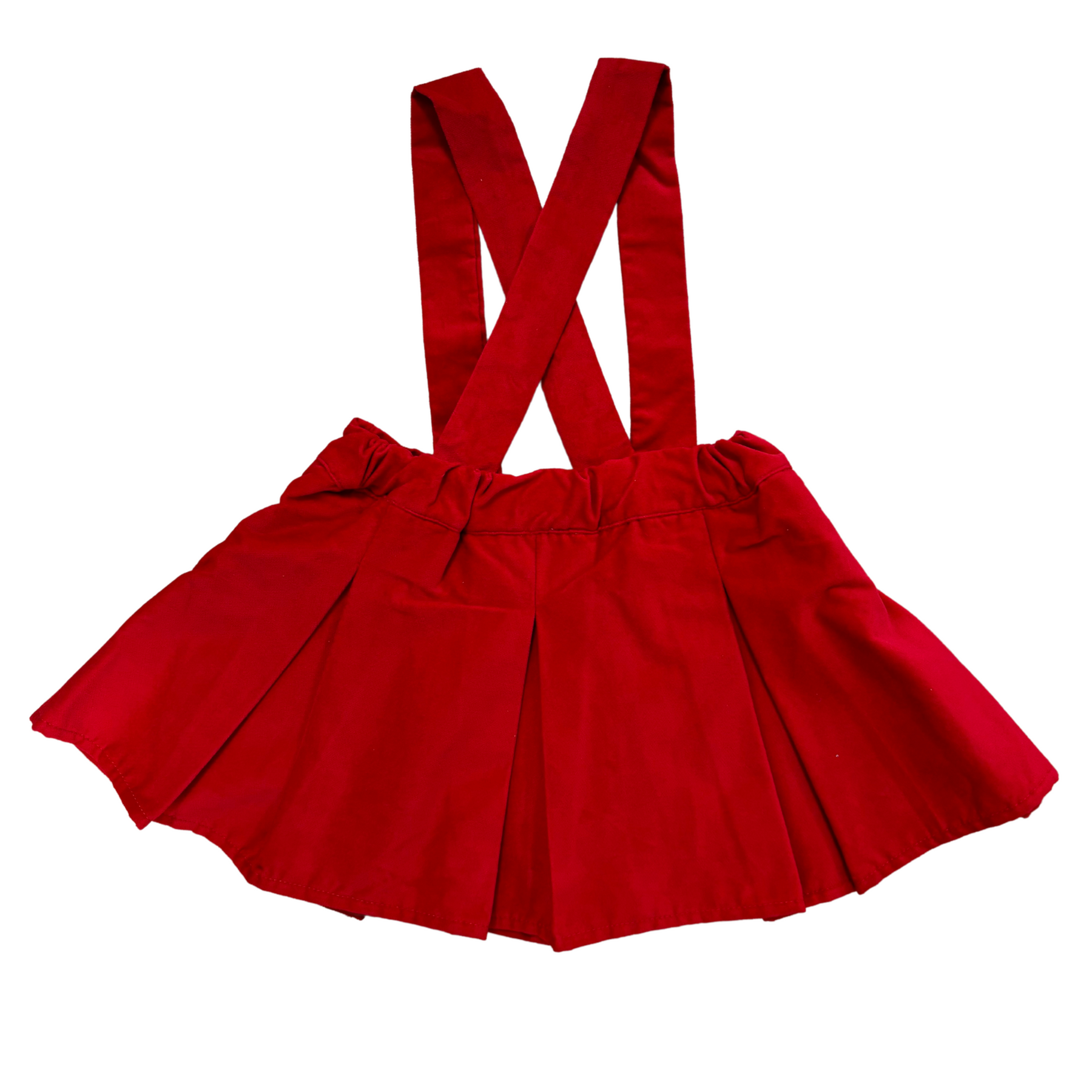 Fantastische velvet plissé rok in een warme kleur rood, de rok heeft bretels en een onderrok. De rok heeft een verstelbare elastische tailleband en is afgewerkt met een velvet strik op de voorzijde. De rok is ook een prachtige kerst outfit maar ook in het dagelijks leven ideaal te dragen. Combineer de rok met een mooie romper met sierlijke ronde kraag en eventueel een gebreid vestje.