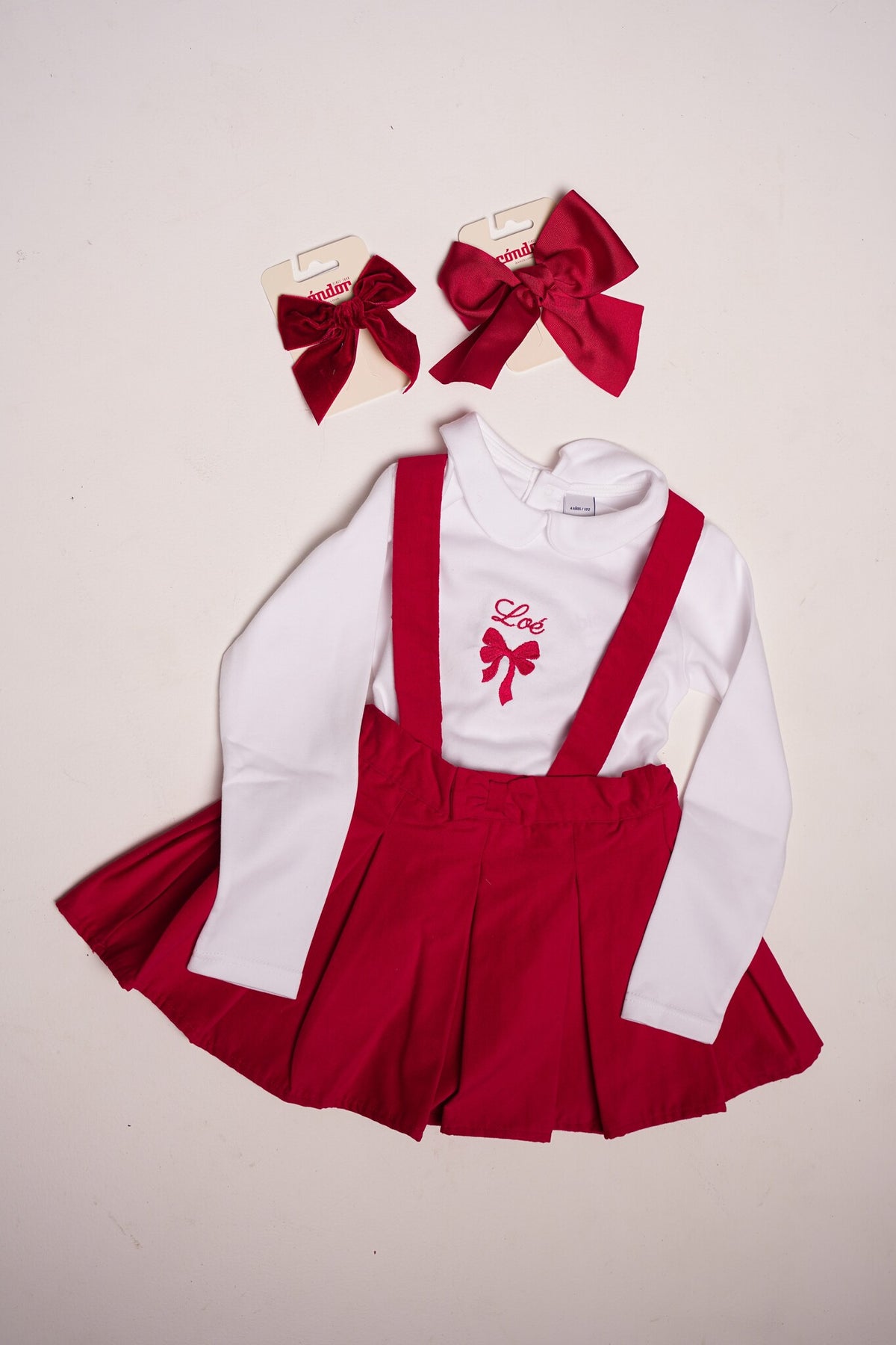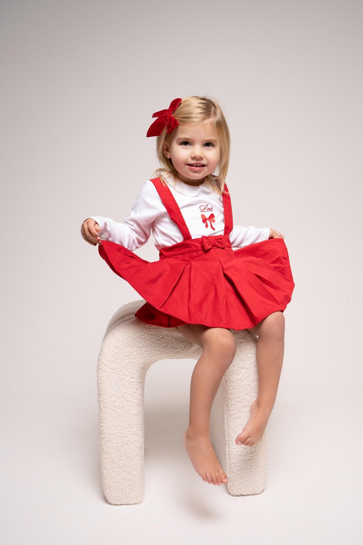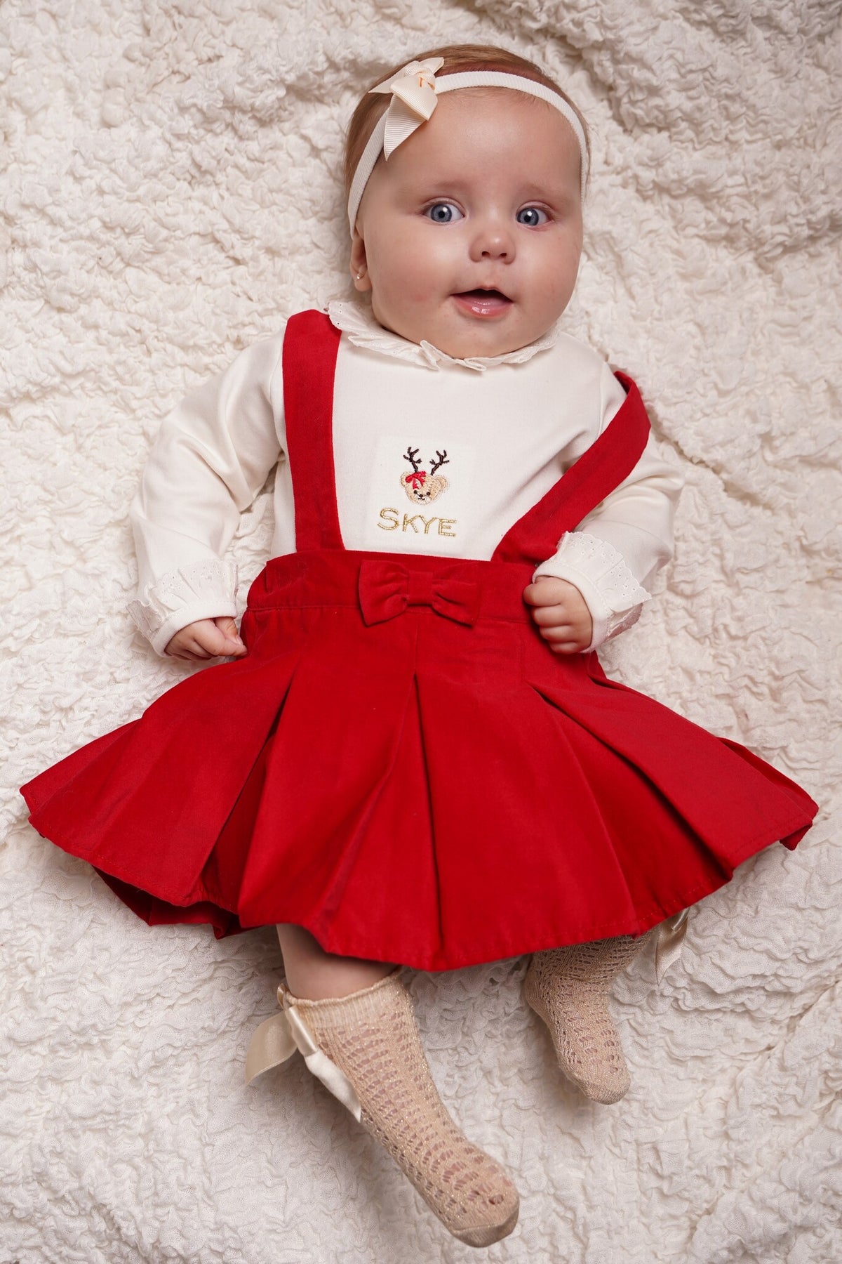 Fantastische velvet plissé rok in een warme kleur rood, de rok heeft bretels en een onderrok. De rok heeft een verstelbare elastische tailleband en is afgewerkt met een velvet strik op de voorzijde. De rok is ook een prachtige kerst outfit maar ook in het dagelijks leven ideaal te dragen. Combineer de rok met een mooie romper met sierlijke ronde kraag en eventueel een gebreid vestje.