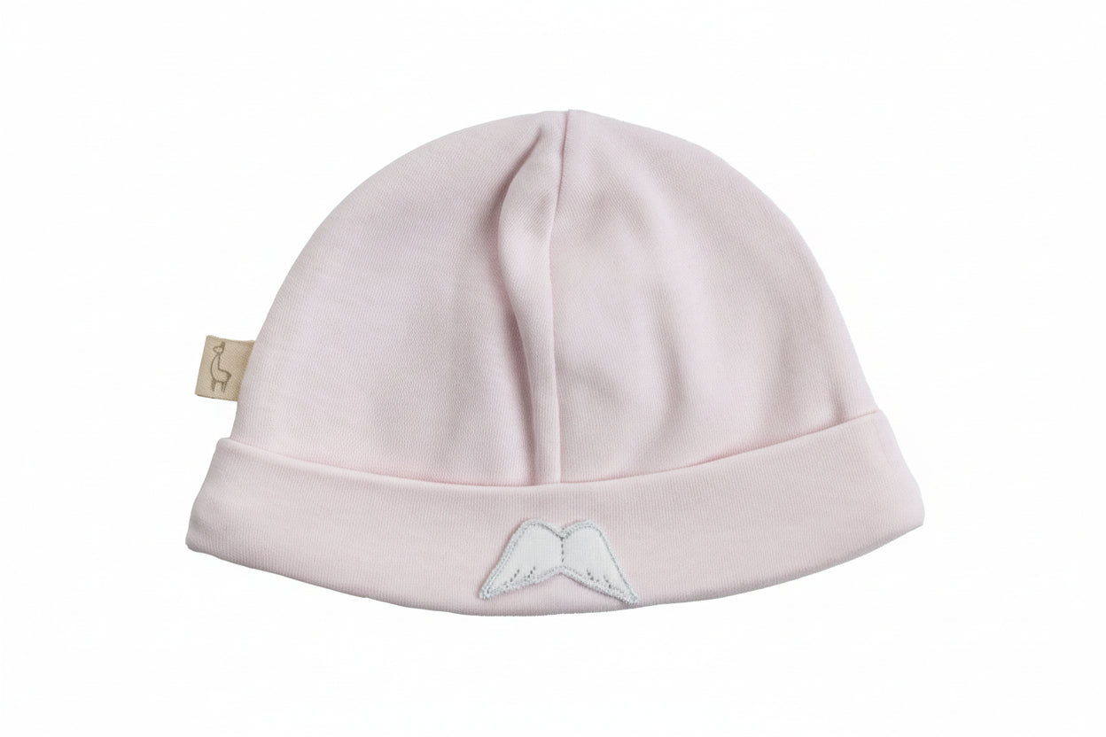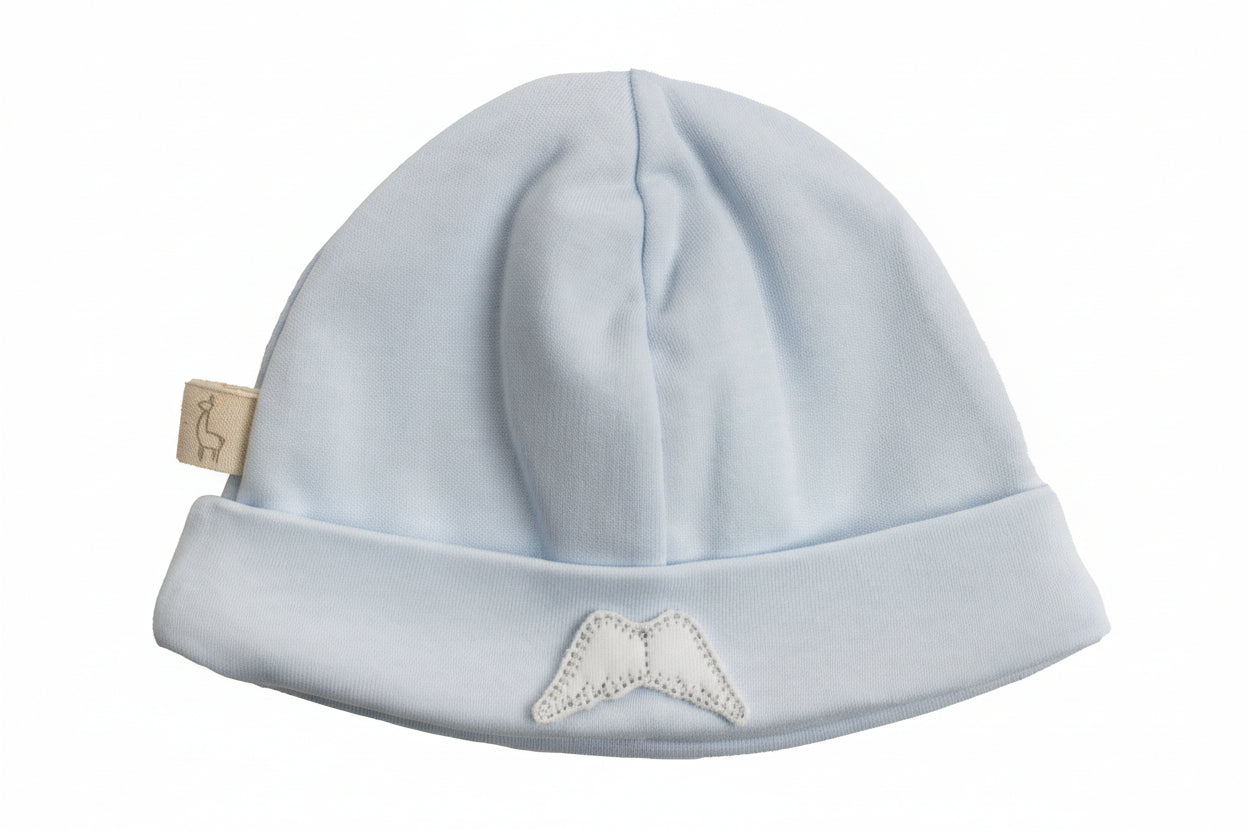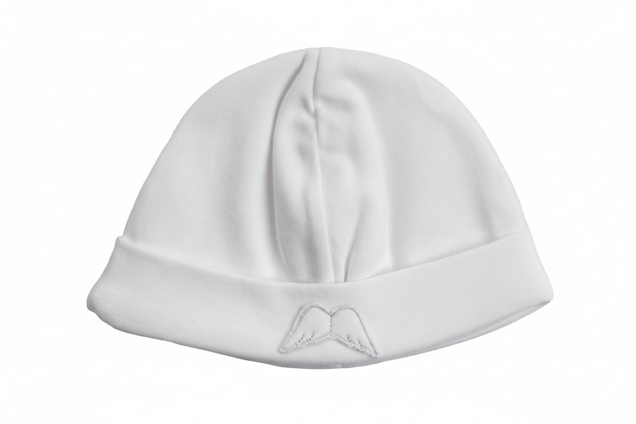 Dit zachte baby mutsje van katoen is perfect voor pasgeboren baby’s en verkrijgbaar in de kleuren wit, roze en blauw. Het mutsje is afgewerkt met een subtiel geborduurd vleugeltje op de omslag, wat zorgt voor een lieve en tijdloze uitstraling.