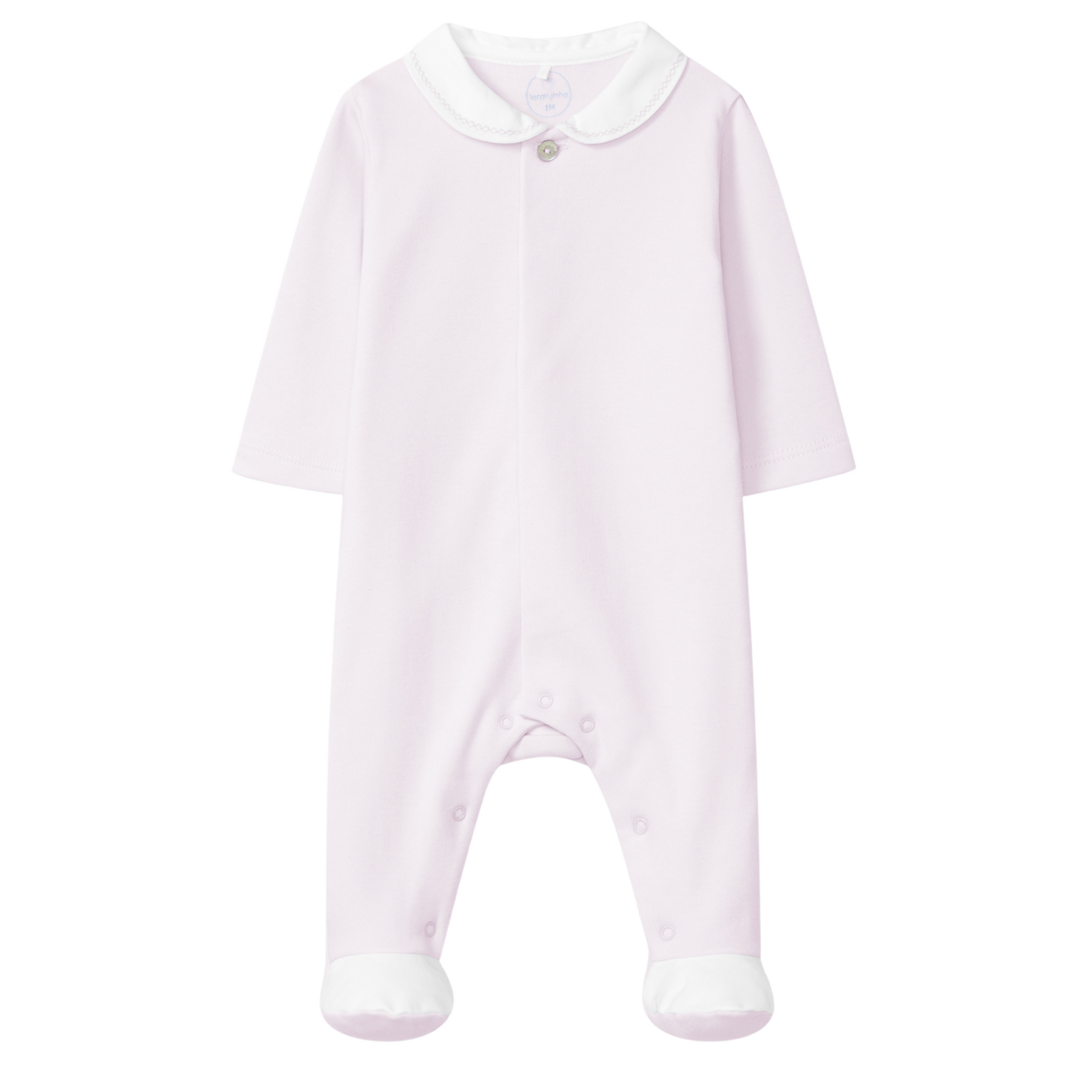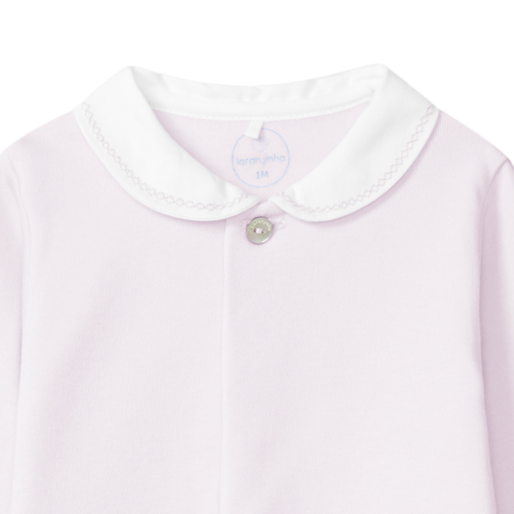 Dik katoen boxpakje van het merk Laranjinha, omdat dit pakje van een dikkere katoenen stof is welke super zacht is aan de binnenkant is hij perfect te dragen in de winter. Het basic babypakje heeft een prachtige afwerking van een glansakatoenen kraag met schattige subtiele borduren, het glans toen is weer terug te zien op de voetjes van het pakje. Aan de voorzijde heeft het pakje een blinde sluiting van druk knoopjes en aan de bovenkant een parelmoer kleurig knoopje.