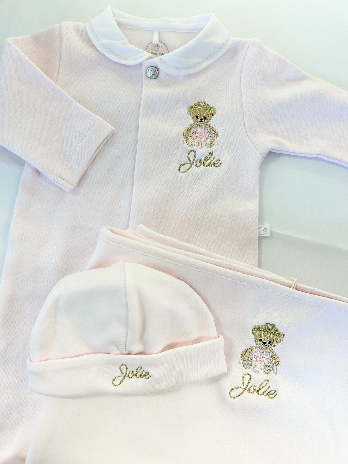 Het merk Laranjinha heeft verschillende items welke bijpassend zijn bij dit pakje, denk aan een mutsje, dekentje en zelfs slabbers.