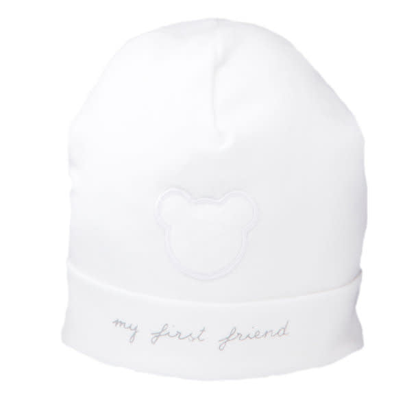 Bonnet Mutsje van First (My First Collection) aan de voorkant afgewerkt met de bekende My First Friend. Het beertje is van een mooie gebreide stof in de kleur wit. De tekst my first friend is van een lichtgrijze kleur. Is zowel draagbaar voor een jongen of meisje.