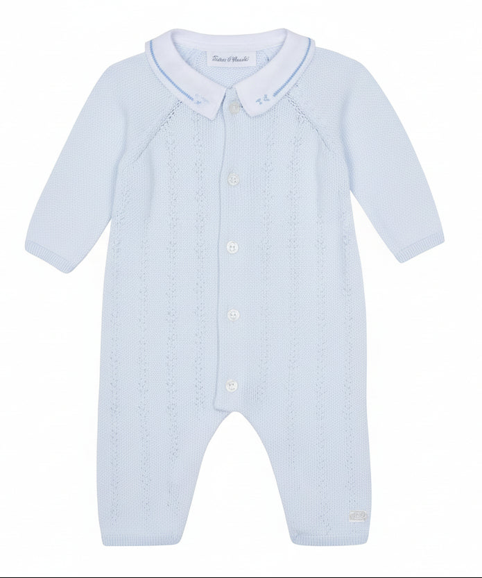 Dit verfijnde babypakje van Tartine et Chocolat is uitgevoerd in een zachte, lichtblauwe tint en afgewerkt met een elegante kraag. Dankzij het comfortabele materiaal en de praktische knoopsluiting is dit pakje ideaal voor dagelijks gebruik tijdens de warmere maanden.