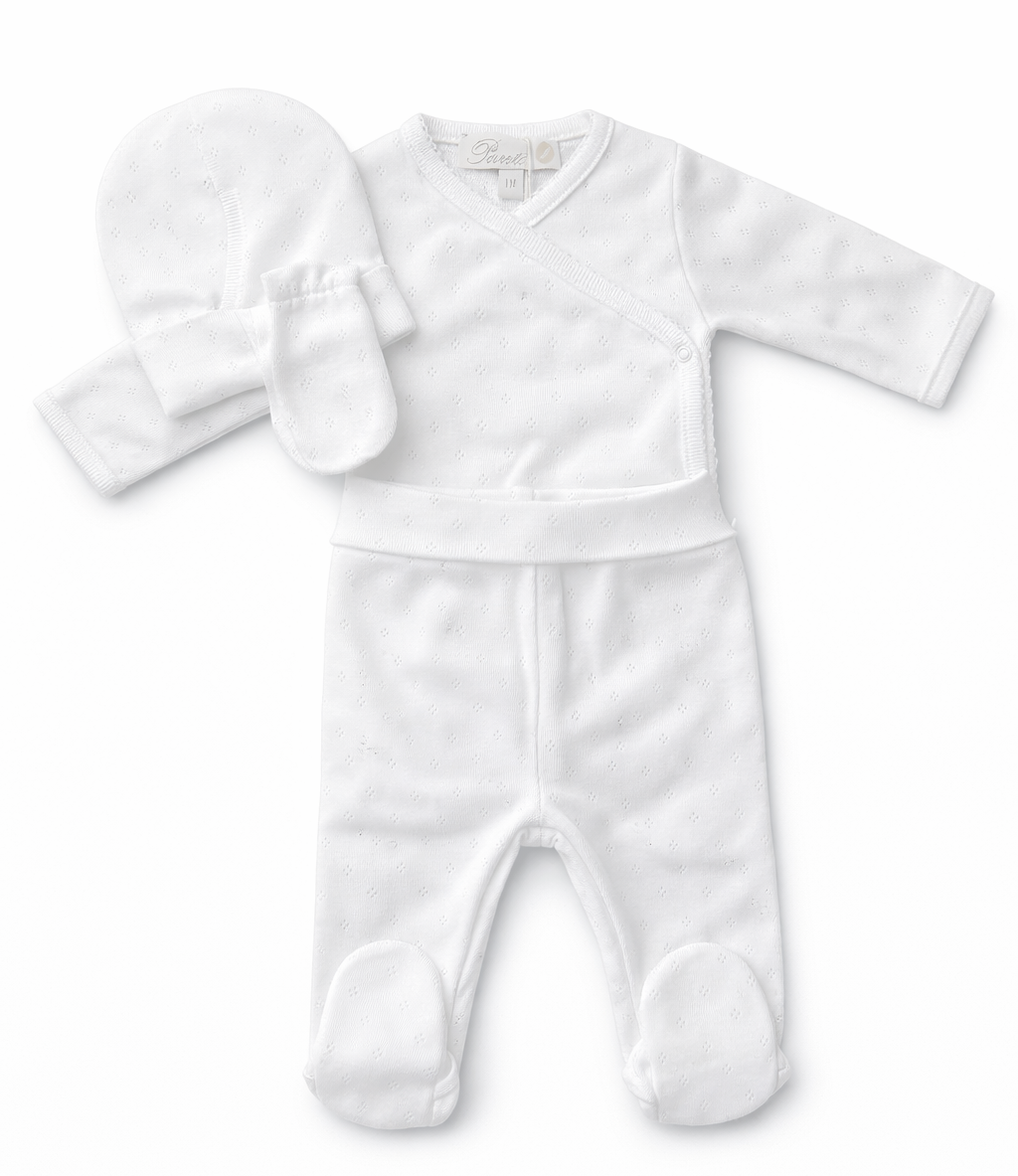 De set bestaat uit een oversla romper, een bijpassend broekje met voetjes, een zacht baby mutsje en wantjes. Dankzij de overslaglsiting is de romper bijzonder geschikt voor pasgeboren baby's en biedt deze extra comfort bij het aan- en uitkleden.