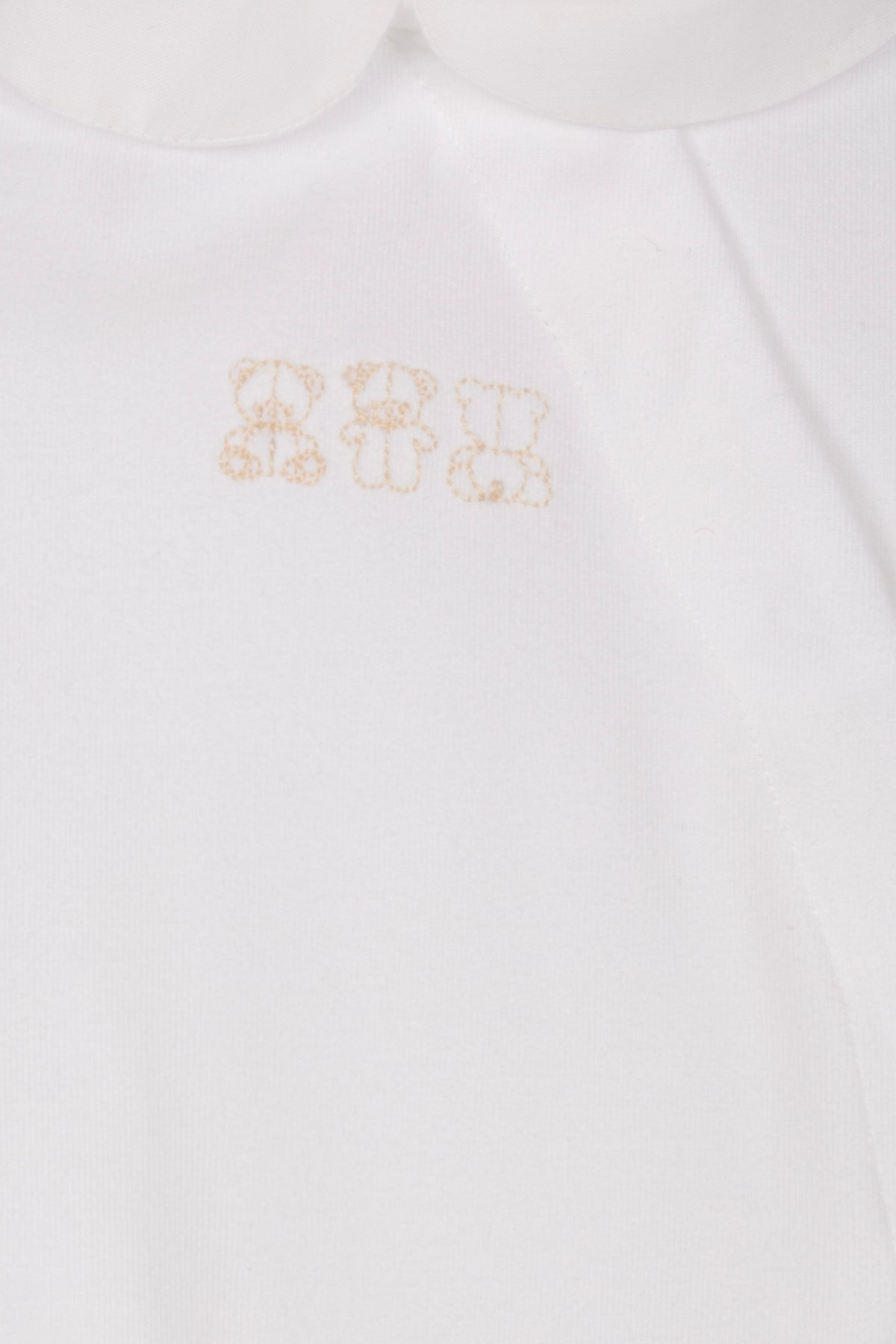 De klassieke ronde Peter Pan kraag geeft het pakje een elegante uitstraling, terwijl de subtiel geborduurde beertjes op de borst zorgt voor een lieve en luxe finishing touch. De neutrale witte kleur en minimalistisch ontwerp maken dit babypakje volledig uniseks, geschikt voor zowel jongens als meisjes.