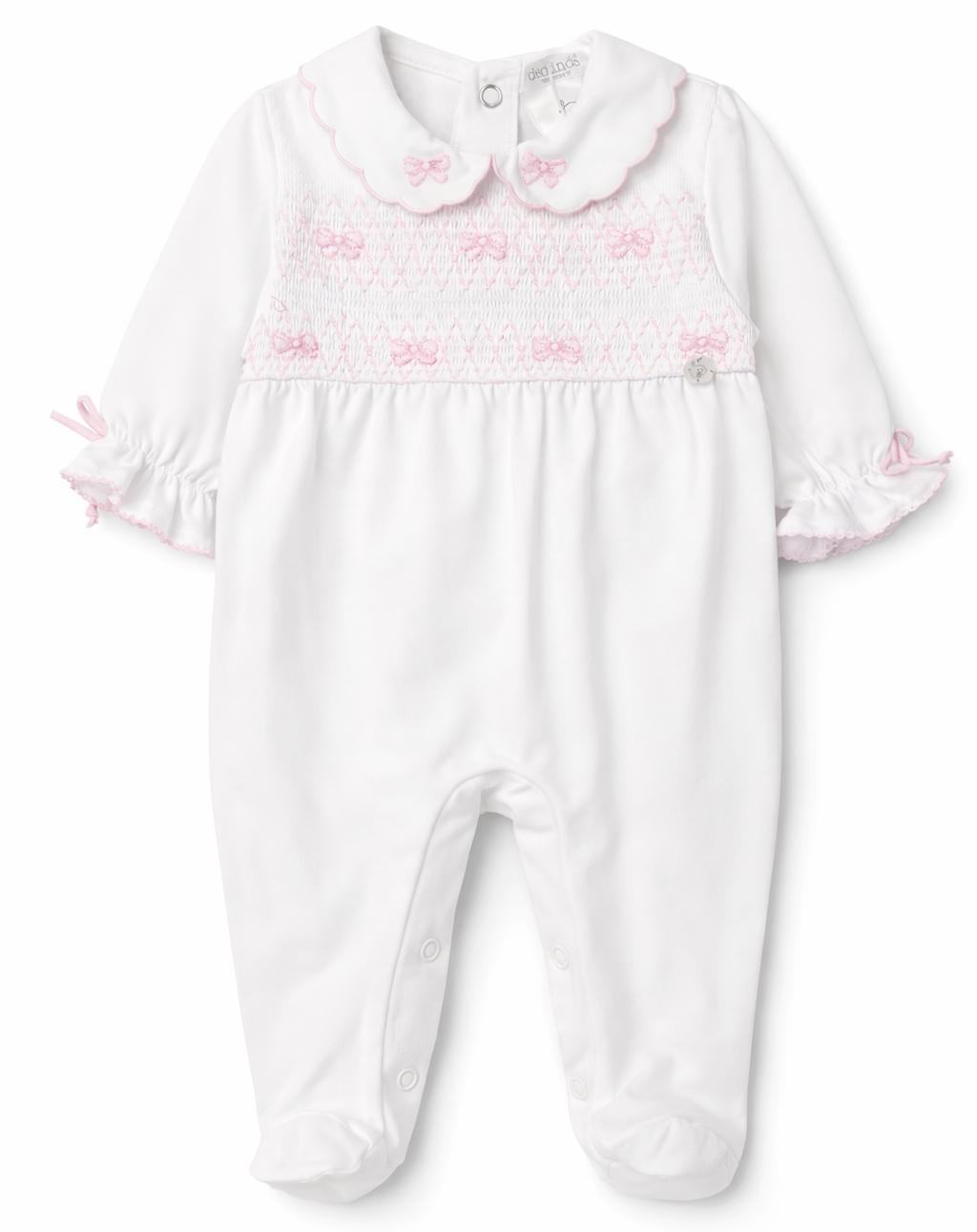 Dit elegante babypakje van Deolinda is een prachtig tijdloos kledingstuik voor meisjes. Het witte pakje is afgewerkt met verfijnd roze smockwerk met kleine strikjes en een klassiek kraagje, wat zorgt voor een zachte en stijlvolle lieve uitstraling.