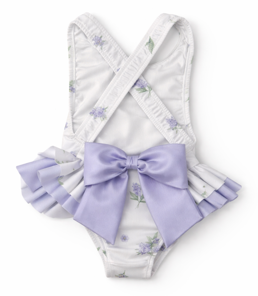 De gekruiste bandjes op de rug geven het badpak een speels en luxe silhouet. Rond de taille is het model afgewerkt met een subtiele volant en een opvallende lila strik op de rug, wat zorgt voor een echte eyecatcher. De zachte pastelkleuren maken dit meisjes badpak perfect voor zonnige stranddagen, vakanties en zwembadmomenten.