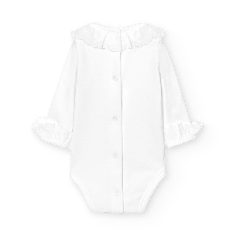 De romper onderscheidt zich door zijn lief rond kraagje en prachtige broderie manchetten, die zorgen voor een klassieke, stijlvolle uitstraling. Dit maakt de romper ideaal voor zowel alledaagse momenten als speciale gelegenheden. De subtiele ruches geven het ontwerp een tijdloze charme. Ook leuk te combineren onder een vestje, gebreide trui of sweater.