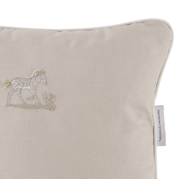 De Prachtige vierkante sierkussen in luxe linnen stof is afgewerkt met een delicaat geborduurde zebra, welke kenmerkend is voor de Safari Collectie van het merk Theophile et Patachou. Het kussen is perfect te decoreren in de Babykamer of box. De kussen is afgewerkt met een mooie beige kleurige bies.