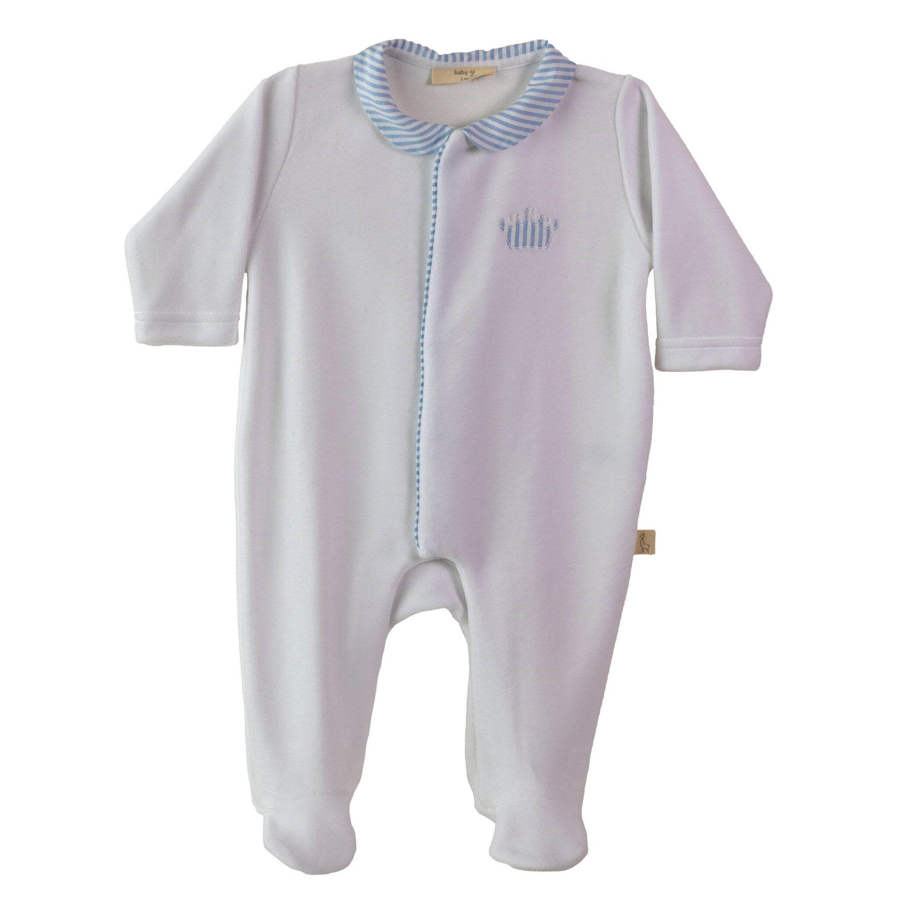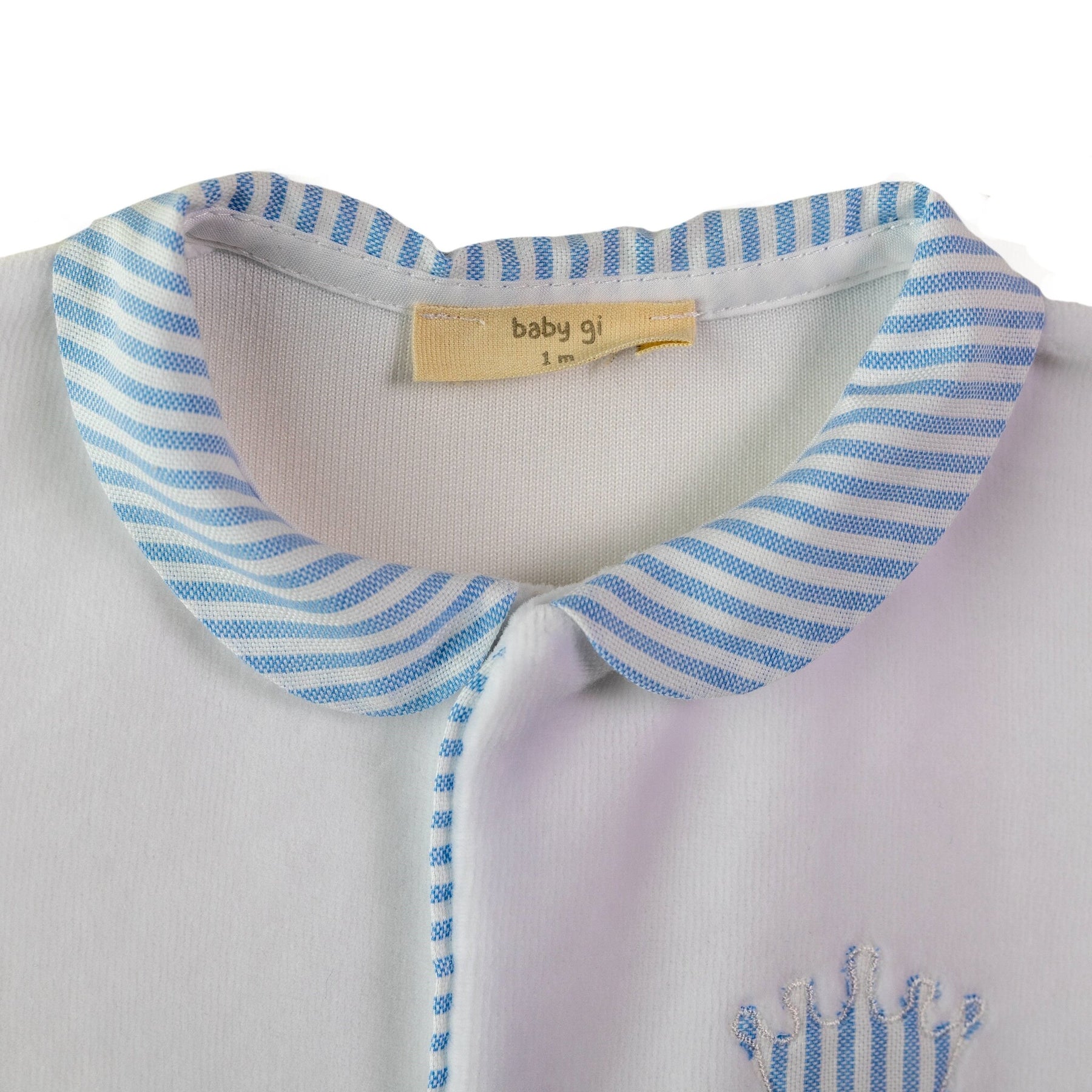 Dit heerlijke zachte velours boxpakje heeft mooie details met streepjes, het kraagje, de bies langs de voor sluiting en het kroontje op de borst van het pakje. Ondanks de lichtblauwe details is het een vrij neutraal pakje. Het pakje is van het merk Baby Gi en heeft mooie bijpassende items