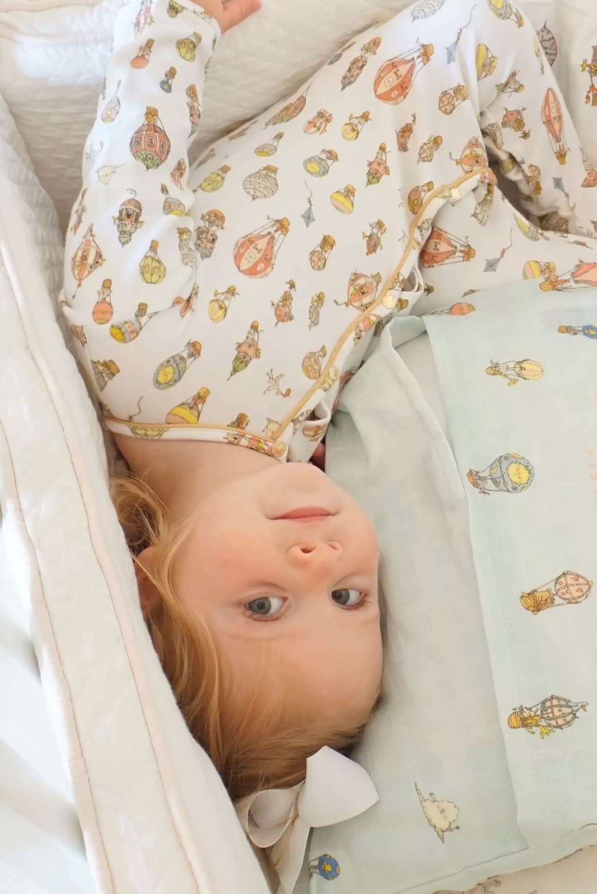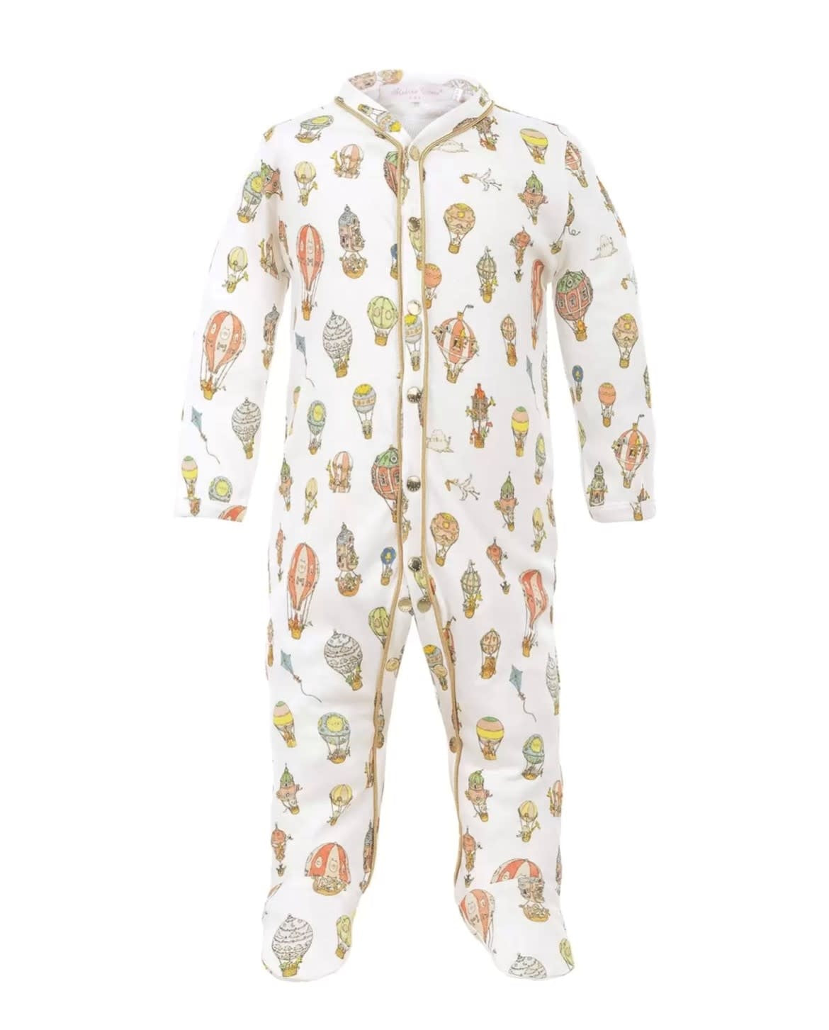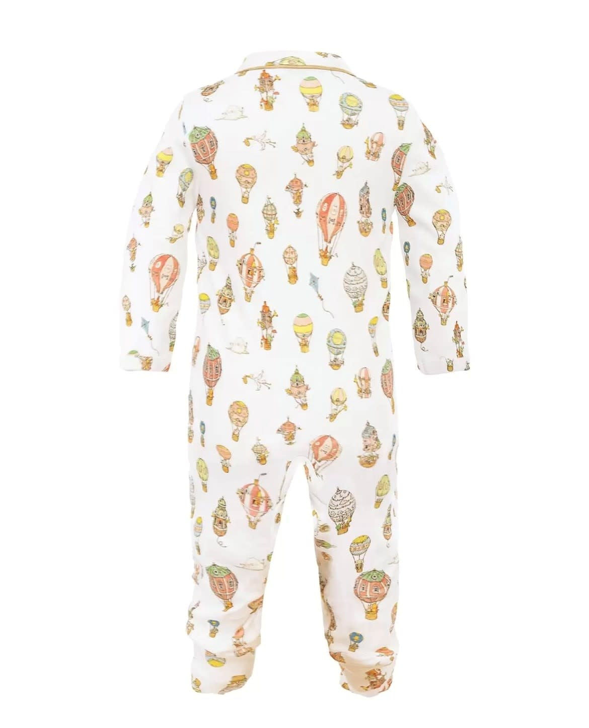Dit luxe katoenen babypakje uitgevoerd in The Hot Air Balloons print van het merk Atelier Choux is van een heerlijke zachte stof. Het pakje is afgewerkt met luxe gouden knoopjes en een glanzende gouden bies rondom de hals en het gehele lijfje. Het babypakje is draagbaar voor zowel jongen als meisje.