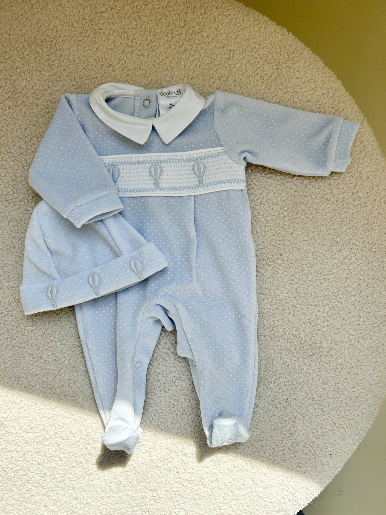 Dit schattige velours boxpakje van Deolinda is lichtblauw van kleur versierd met kleine stipjes. Het pakje heeft een katoen wit punt kraagje en een witte smok band over de borst lopen, deze smok band is versierd met blauw borduursel en super lieve luchtballonnen, wat op dit moment een zeer populair thema is. Het babypakje heeft voetjes en lange mouwen, de lange mouwen hebben hebben elastiek waardoor de uiteinden sierlijk uitlopen, ook vind je hier een klein wit strikje als subtiel mooi detail.
