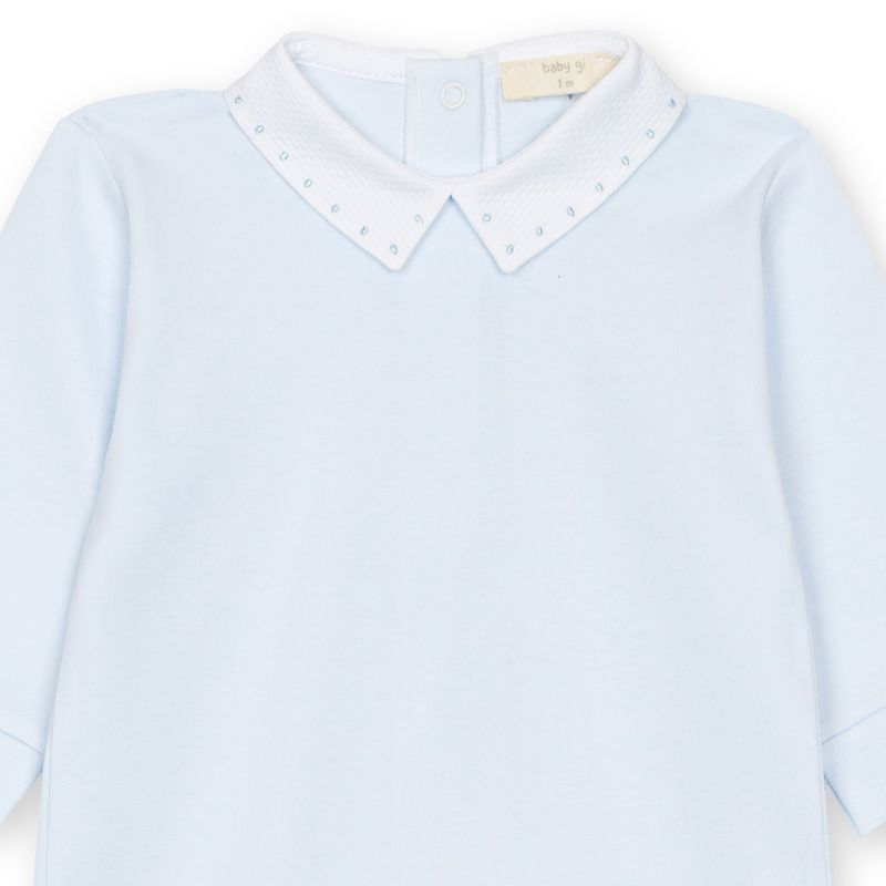 Dit elegante lichtblauwe basic babypakje met piqué kraagje is een tijdloze klassieker voor de allerkleinsten. Het verfijnde kraagje van piqué katoen geeft het boxpakje een luxe stijlvolle uitstraling, perfect voor dagelijks gebruik en als geboortepakje.