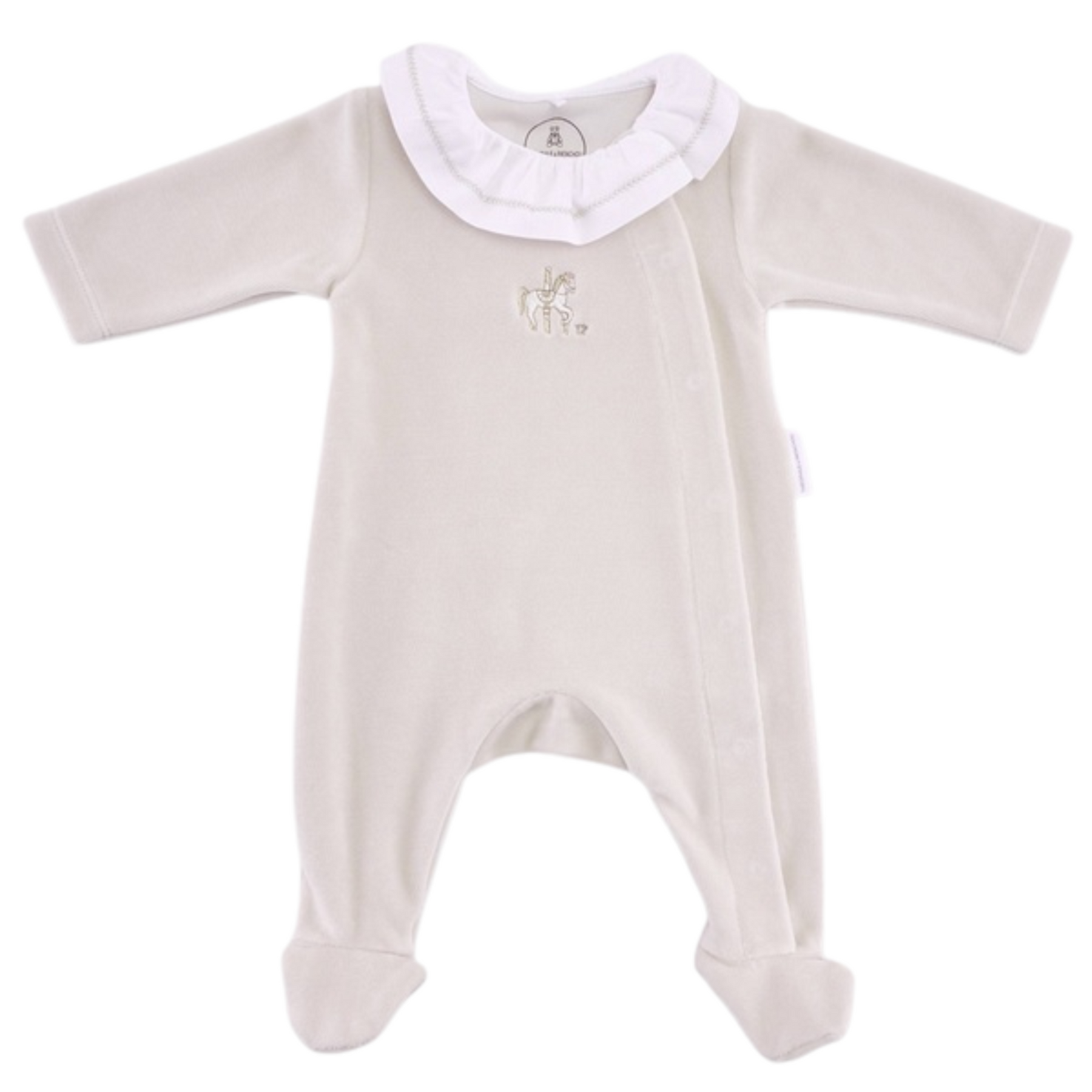 Dit prachtige pakje is gemaakt van velours stof van hoge kwaliteit en is een prachtige warme beige kleur, deze combinatie geeft het pakje een ontzettend rijke uitstraling. Het pakje wordt verrijkt met een super lief popeline kraagje in het wit met beige stiksels en op de voorzijde van het pakje staat het bekende paardje geborduurd uit de carrousel collectie. De drukknoopsluiting van het boxpakje loopt langs de rechterzijde van het pakje en loopt door tussen de beentjes. Het merk Theophile et Patachou heeft een grote collectie in deze lijn.