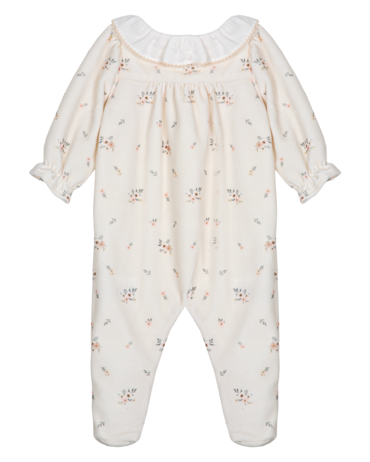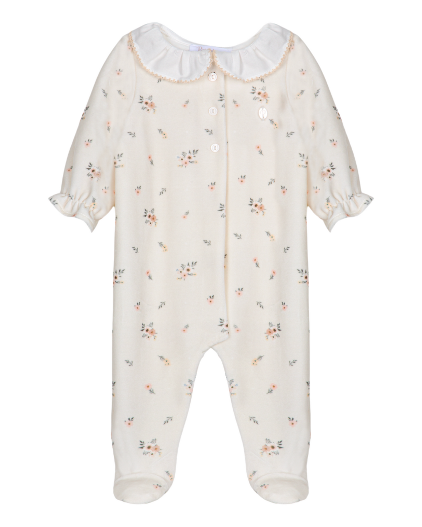Dit lieve en zachte babypakje is gemaakt van prachtig en rijk katoen velours, het setje is een mooie beige kleur en heeft een prachtige elegante bloemenprint print, ook heeft het pakje een off white volant kraagje wat het pakje meteen een elegante twist geeft en het pakje echt voor meisjes maakt. Het pakje heeft lange mouwen, voetjes en drukknoopsluiting aan de voorzijde. Het pakje is ook een prachtig geboortepakje in combinatie met een beige katoenen of velours mutsje.