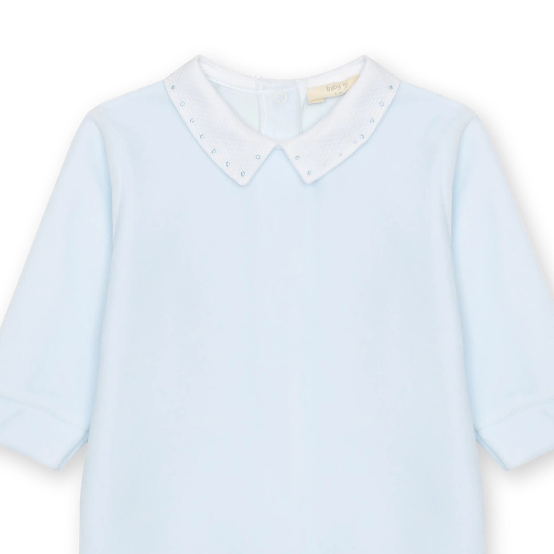 Super lief babypakje in de kleur lichtblauw met witte details zoals de witte pique punt kraag en de witte voetjes. Het pakje is gemaakt van velours. Het pakje heeft voetjes en lange mouwen, ook is het pakje voorzien van een drukknoopsluiting op de rug en tussen de beentjes. De witte pique kraag heeft als lichtblauw details kleine stipjes geborduurd langs de rand.