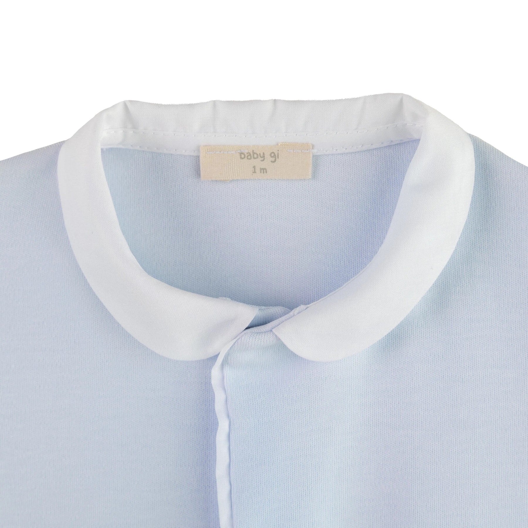 Lichtblauw babypakje in zachte velours stof met rond pique1 kraagje van Baby Gi