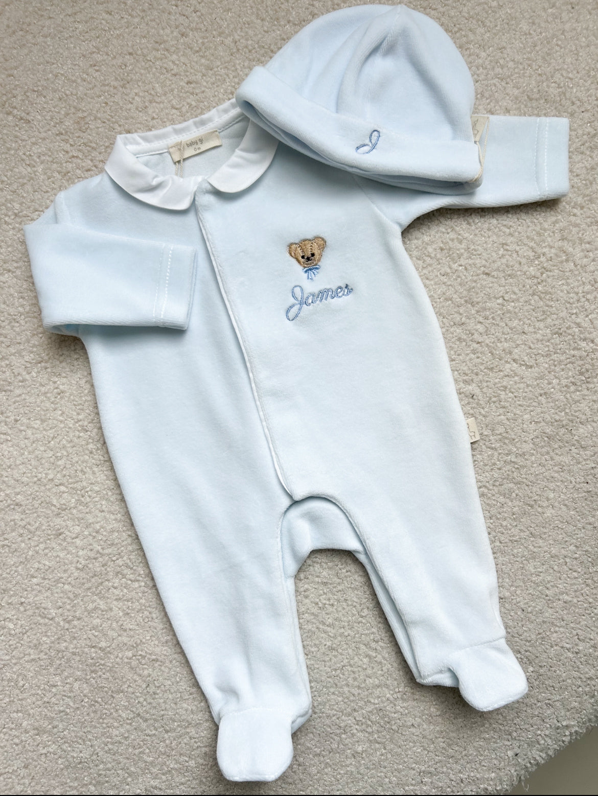 Lichtblauw velours babypakje met wit kraagje gepersonaliseerd met original teddy