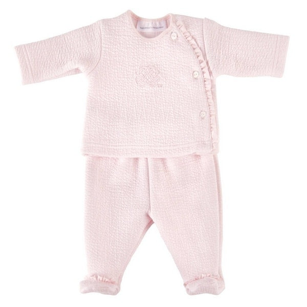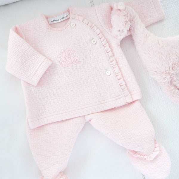 Dit prachtige tweedelige pakje van het merk Theophile & Patachou is van een gewafelde jersey katoenen stof, de top is aan de voorkant versierd met een delicaat borduurwerk. Het babypakje met voetjes is afgewerkt met sierlijke details zoals de ruche rand bij de overslag top en op de voetjes. Het pakje past perfect bij alle items uit de Cotton Pink collectie.