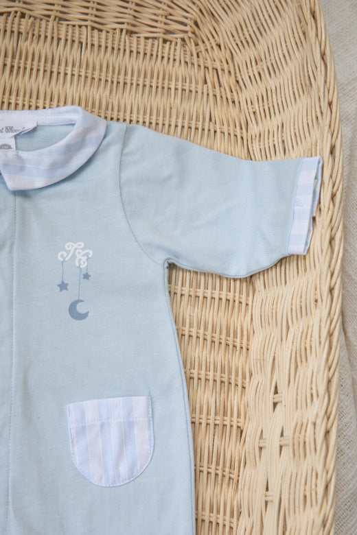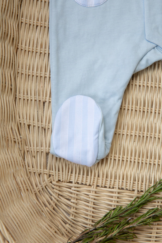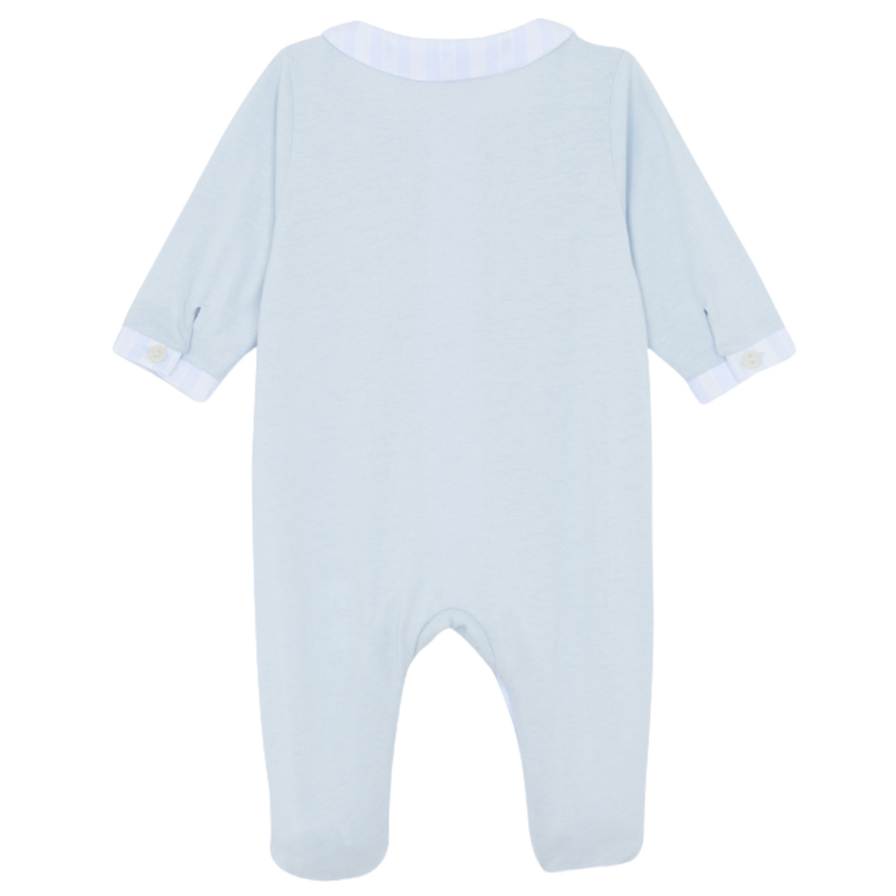 Heerlijk zacht katoen babypakje met voetjes in lichtblauw met details uit de Garda Collectie van het merk Tartine et Chocolat. De Garda collectie kenmerkt zich door het mooie glans katoenen streep motief. In het boxpakje is dit verwerkt in het mooie ronde kraagje, de voetjes, de manchetten en de zakjes aan de voorkant van het pakje. Ook heeft het pakje een lief konijnen afbeelding en het TC logo aan de voorkant. Het pakje is perfect voor alle jaargetijden.