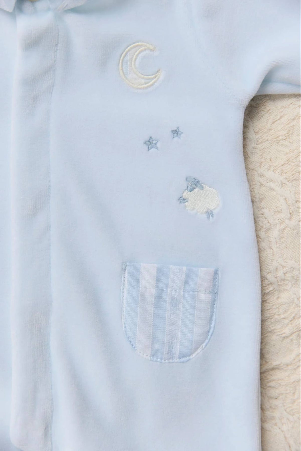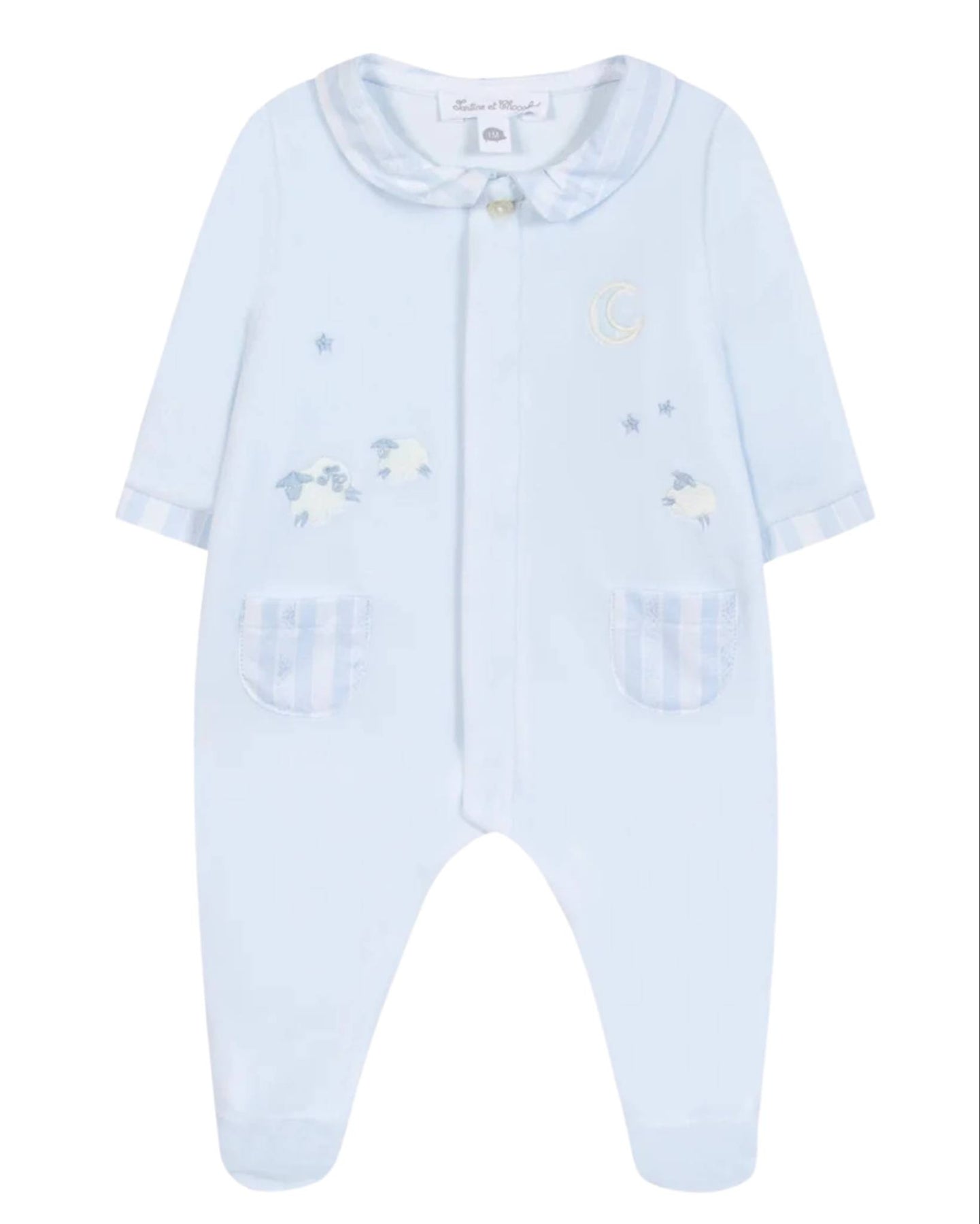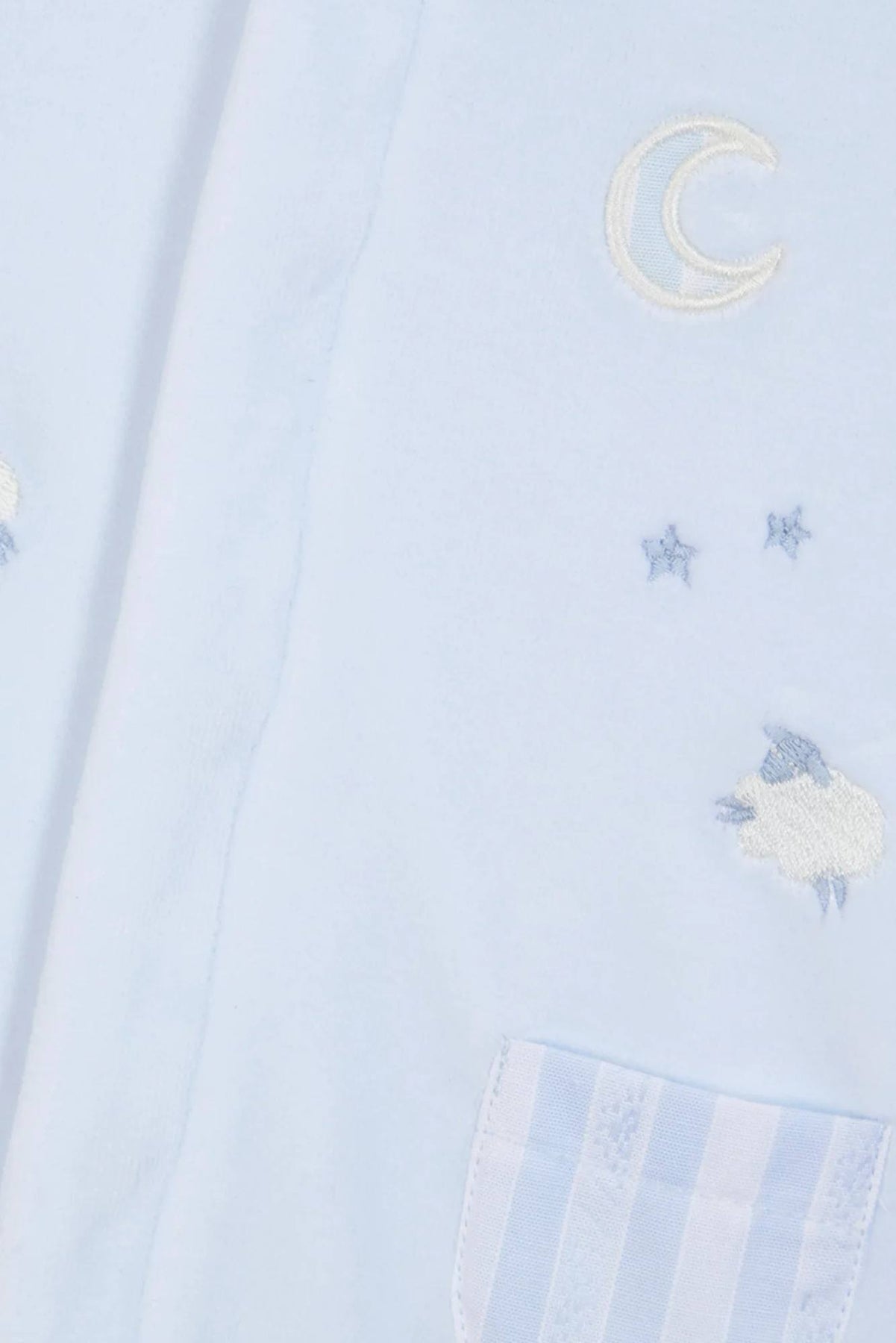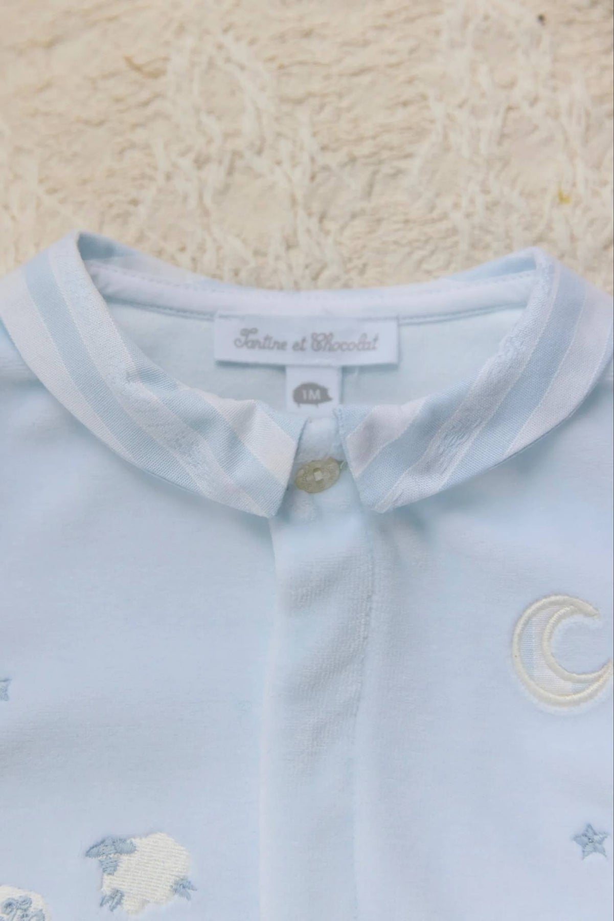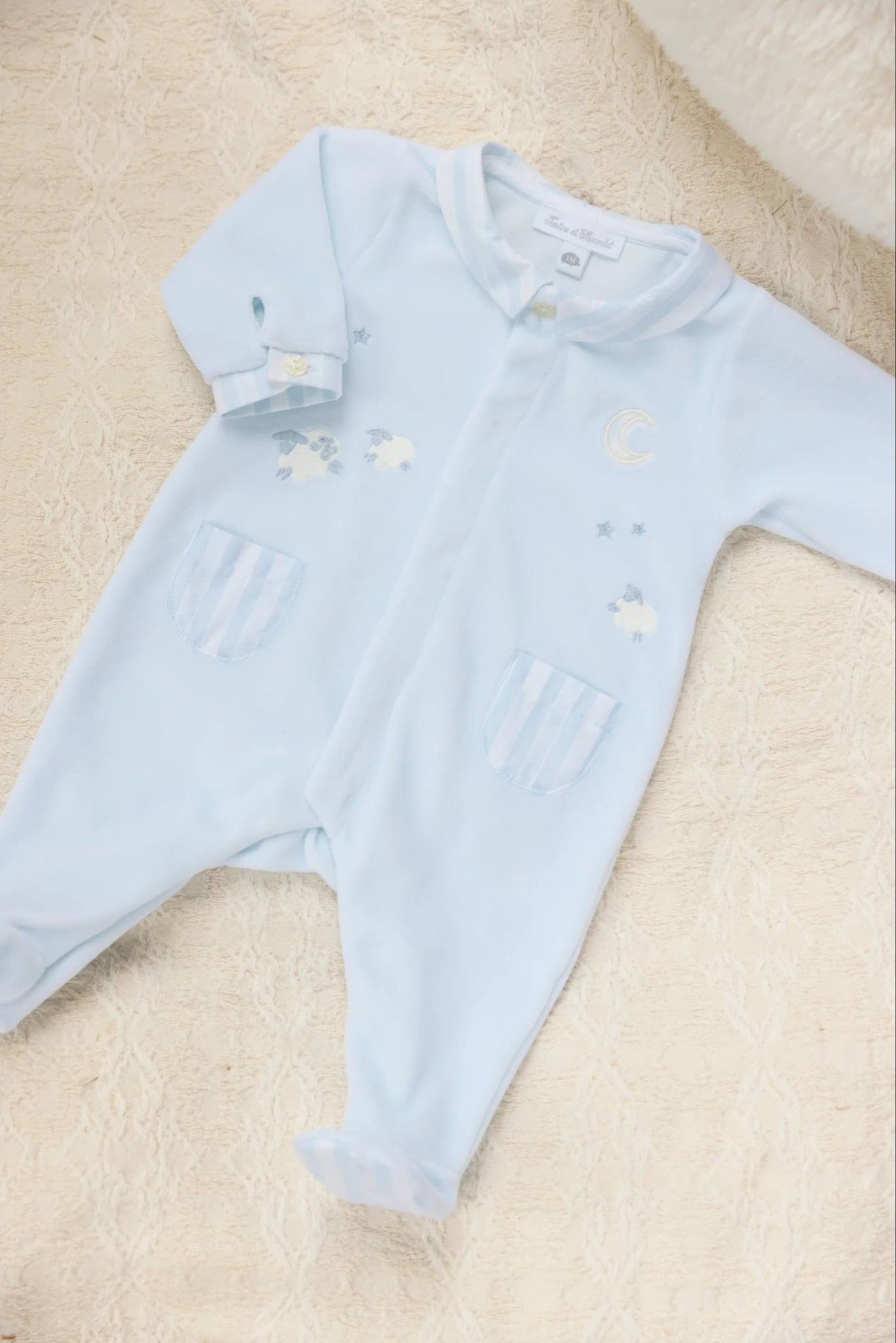 Dit warme babypakje van Tartine et Chocolat is gemaakt van zachte lichtblauw velours en behoort tot de verfijnde garda-collectie. De voorkat is versierd met subtiele borduursels van schaapjes (mouton), sterretjes en een maantje, wat het pakje een dromerige uitstraling geeft.