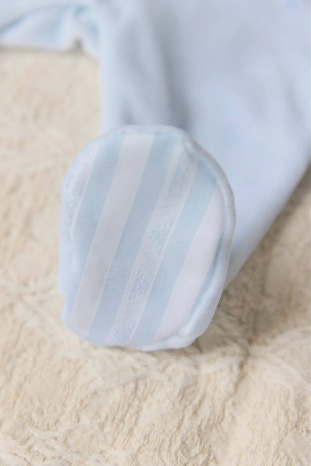 Het ronde Peter Pan-kraagje, de manchetten, voetjes zijn afgewerkt met een stijlvol lichtblauw-wit streep motief welke terug komt in de Garda-Collectie. Het klassieke babypakje welke tijdloos is is van een zachte velours stof met voetjes. Ideaal voor de koudere dagen