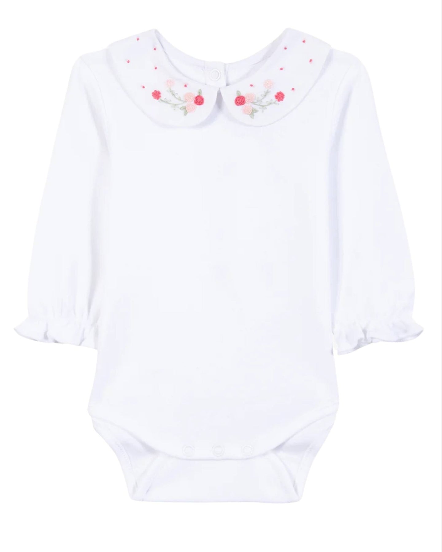 Deze prachtige witte romper met bloemenkraag van Tartine et Chocolat is een echte klassieker die elk seizoen terug komt in de collectie. Gemaakt van zacht kantoen en afgewerkt met een verfijnd geborduurd bloemmotief in zachte roze ze koraal rode tinten. De peter pan-kraag en subtiele ruches aan de lange mouwen zorgen voor een Romantische look.