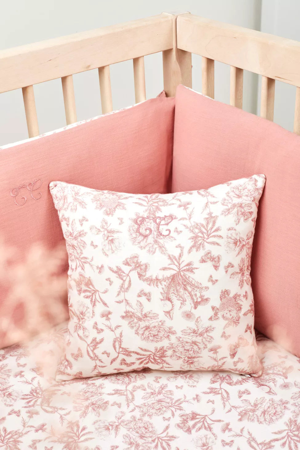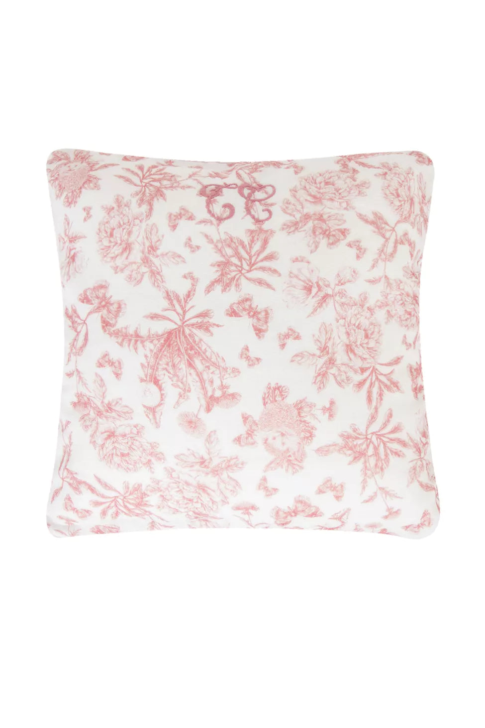 Sierkussen in Toile de Jouy print van het merk Tartine et Chocolat. De kussen is omkeerbaar. Aan de ene zijde heeft hij de Toile de Jouy print aan de andere zijde de linnen achtige stof met het Tartine et Chocolat logo.
