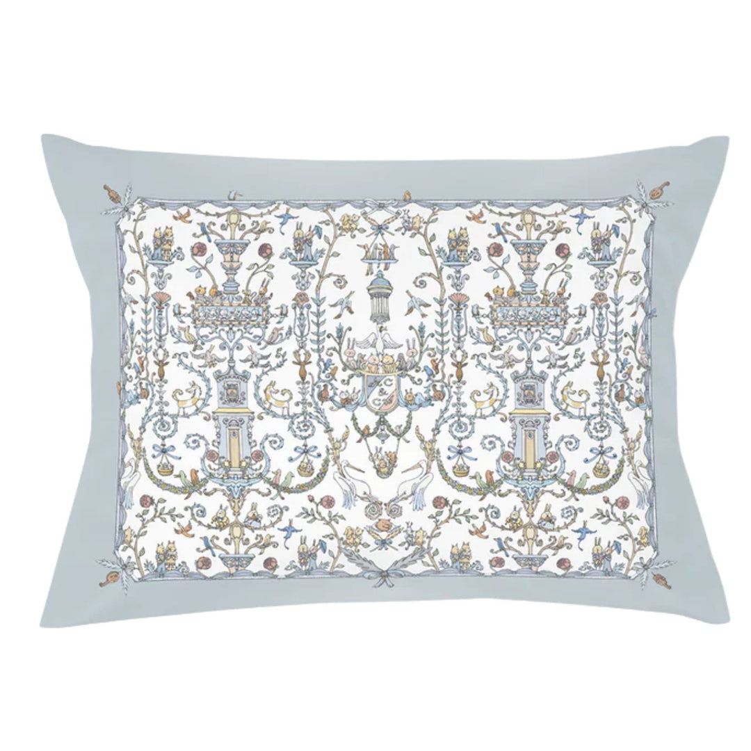 De Toile de Jouy-print is verkrijgbaar in twee zachte tinten: Lichtroze en lichtblauw. Beide varianten zijn subtiel en stijlvol - perfect m te combineren in elke babykamer of kinderkamer. De collectie omvat carrés (hydrofiele doeken van 100% Biologisch katoen), slabbetjes hoeslakens, dekbedovertrekken en kussentjes allemaal in dezelfde handgetekende print.