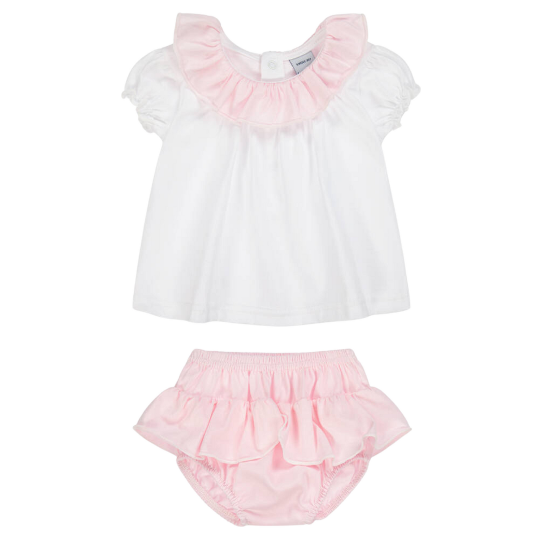 Deze heerlijke katoenen zomerse set heeft een mooie basic top met schattige pofmouwtjes het t-shirt heeft een katoenen volant kraag in dezelfde lichtroze kleur als de bloomer. Het t-shirtje heeft aan de achterkant druk knoopjes waardoor hij gemakkelijk open en dicht kan. De schattige bloomer in lichtroze kleur is exact van dezelfde stof als het shirt. De bloomer heeft een grote ruche in het lichtroze. Het setje is een heerlijk setje voor de echte warme dagen.