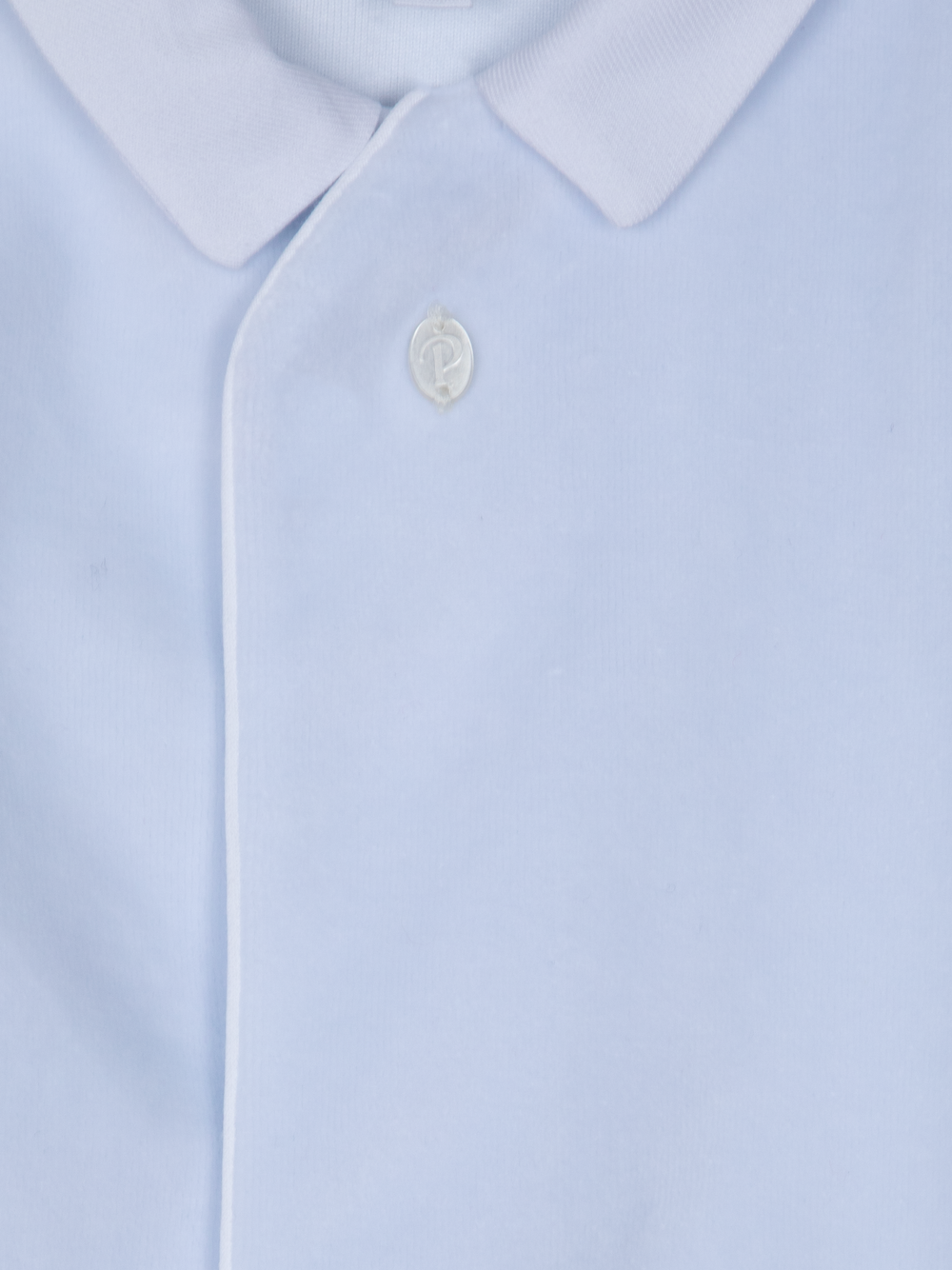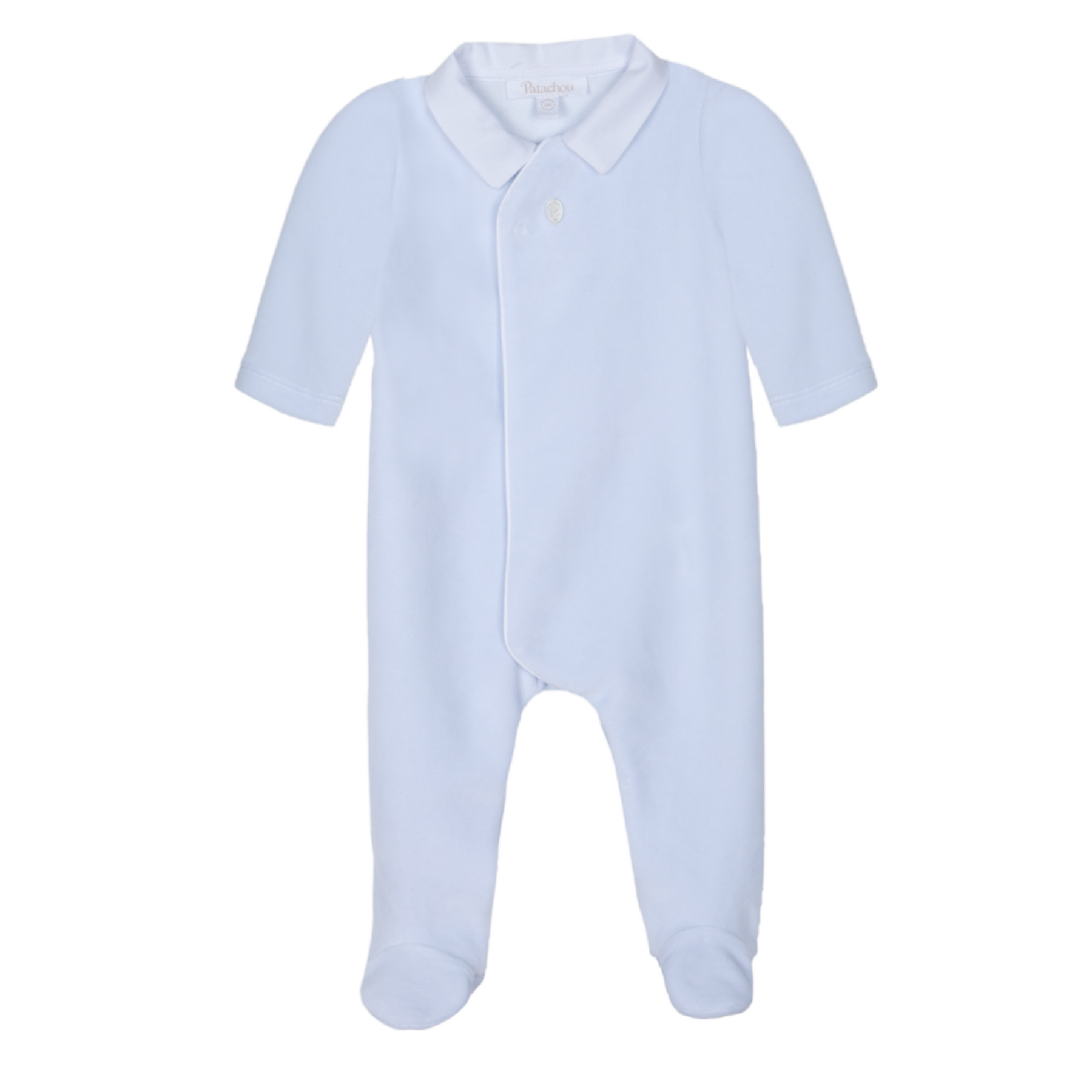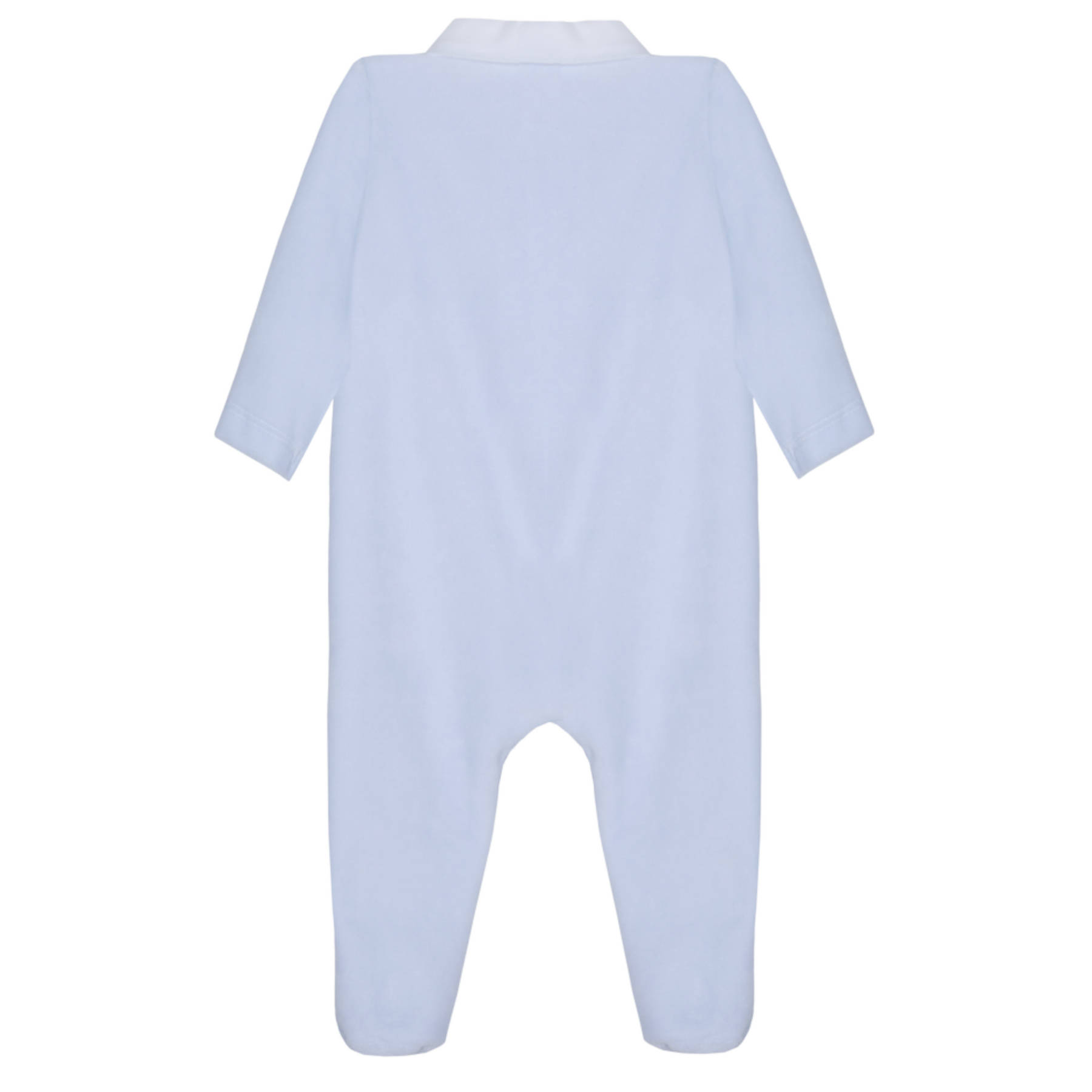 Dit super mooie pakje is gemaakt van een rijke kwaliteit velours katoen, het pakje is daardoor heel erg zacht en warm en daarmee dus uitermate geschikt voor winter baby's. Het pakje is lichtblauw van kleur en heeft een witte punt kraag van katoen. Het pakje heeft lange mouwen en voetjes, ook is het boxpakje voorzien van een drukknoopsluiting aan de voorzijde welke doorloopt tussen de beentjes om zo het aan en uitkleden en natuurlijk verschonen zo makkelijk en comfortabel mogelijk te maken. Combineer het pakje met een mooie witte velours deken en mutsje om er een mooie geboorte of newborn set van te maken.