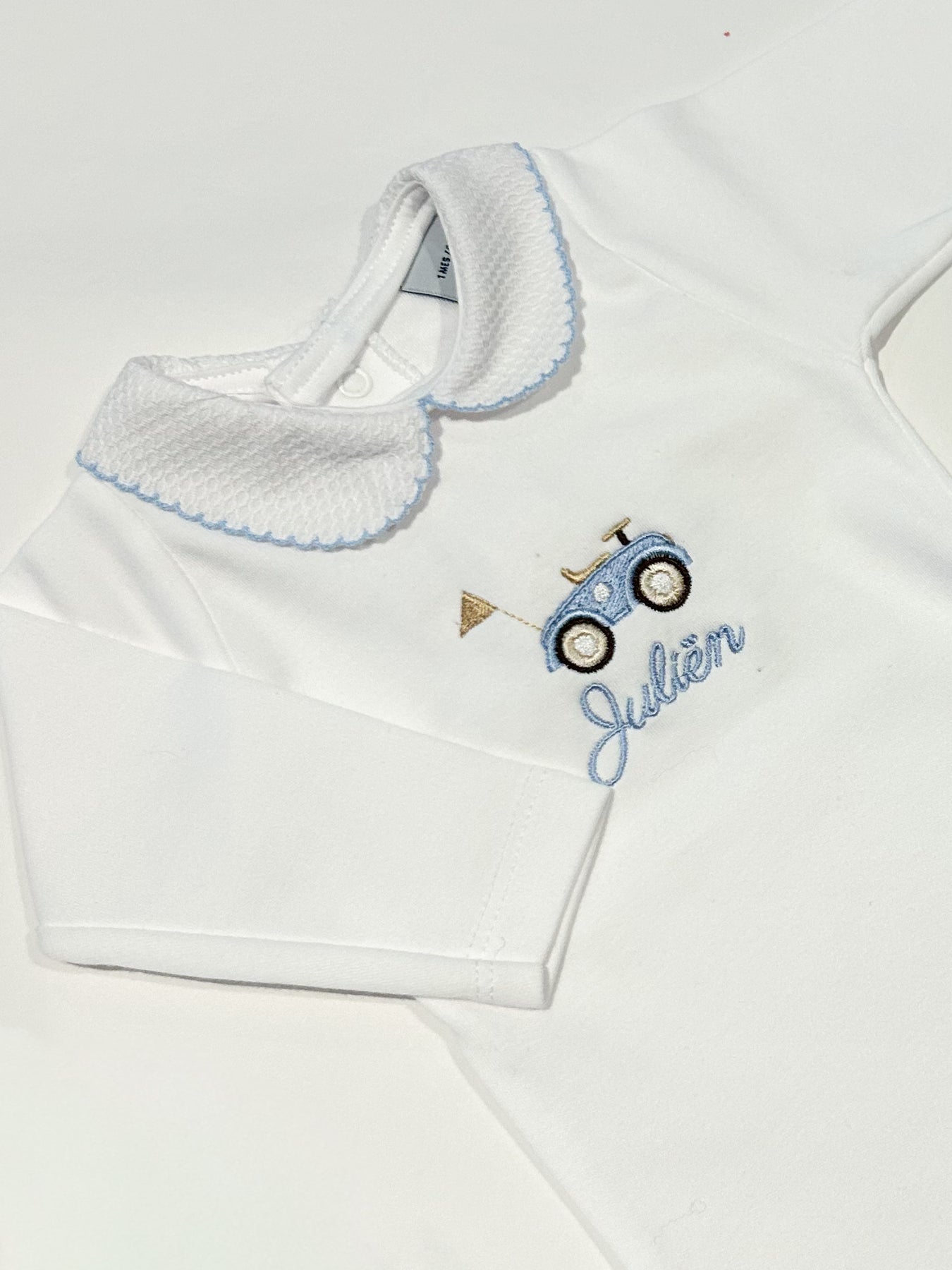Deze prachtige Babidu romper met lange mouwen heeft een verfijnde Peter Pan kraag van zachte witte piqué stof. Rond het kraagje loopt een subtiel geborduurd biesje in één van de stijlvolle kleuren: Bordeaux, lichtblauw, lichtroze, wit, beige of donkerblauw. Een echte klassieker met een luxe uitstraling. Perfect voor zowel jongens als meisjes.