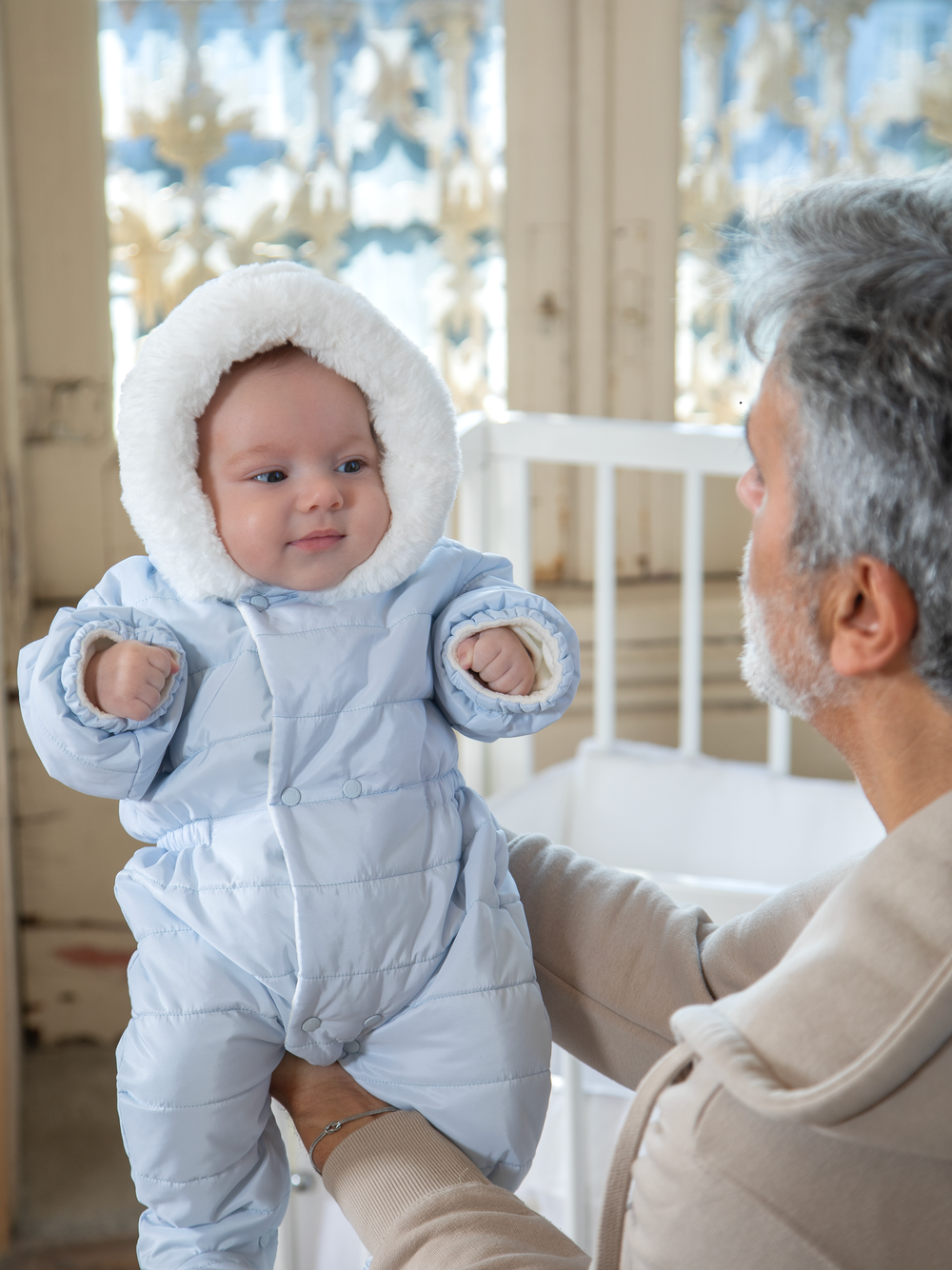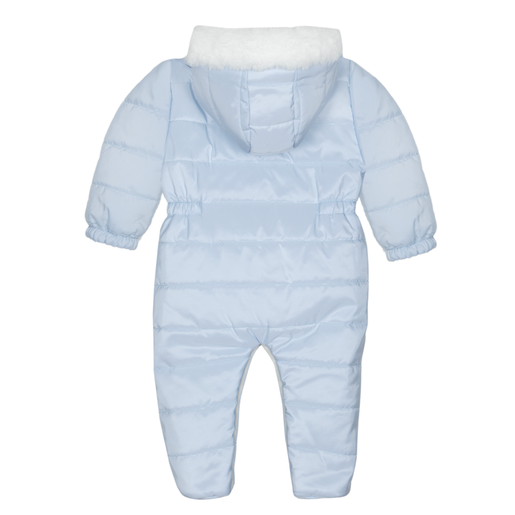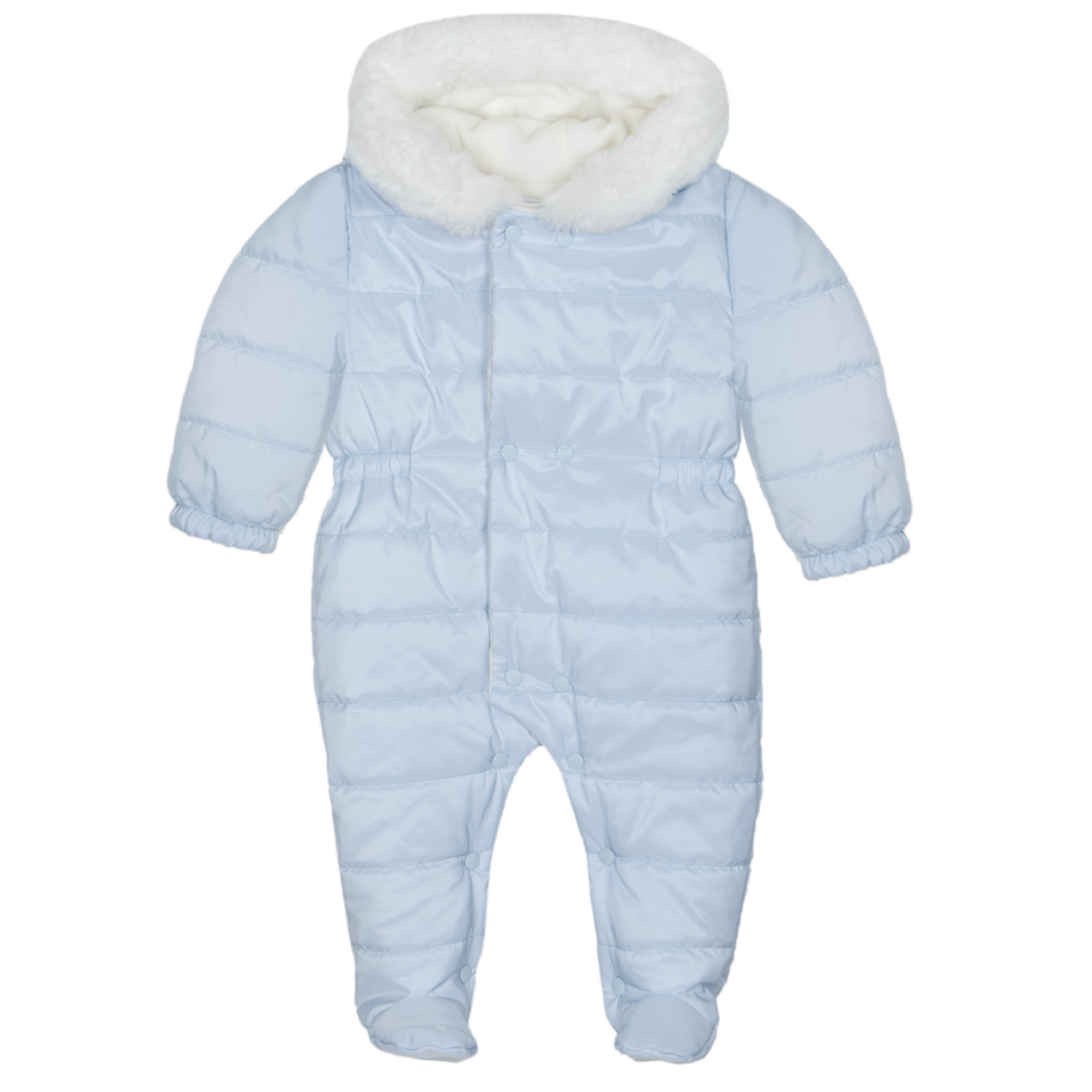 Ga behaaglijk en stijlvol de koude winterdagen in met dit prachtige skipak van het mooie merk Patachou. Het skipak is lichtblauw van kleur, heeft een capuchon en voetjes, het pak is voorzien van een dubbele drukknoopsluiting. Het pak heeft een lekkere warme en zachte fleecevoering en de capuchon heeft een faux fur omranding in de kleur off white.